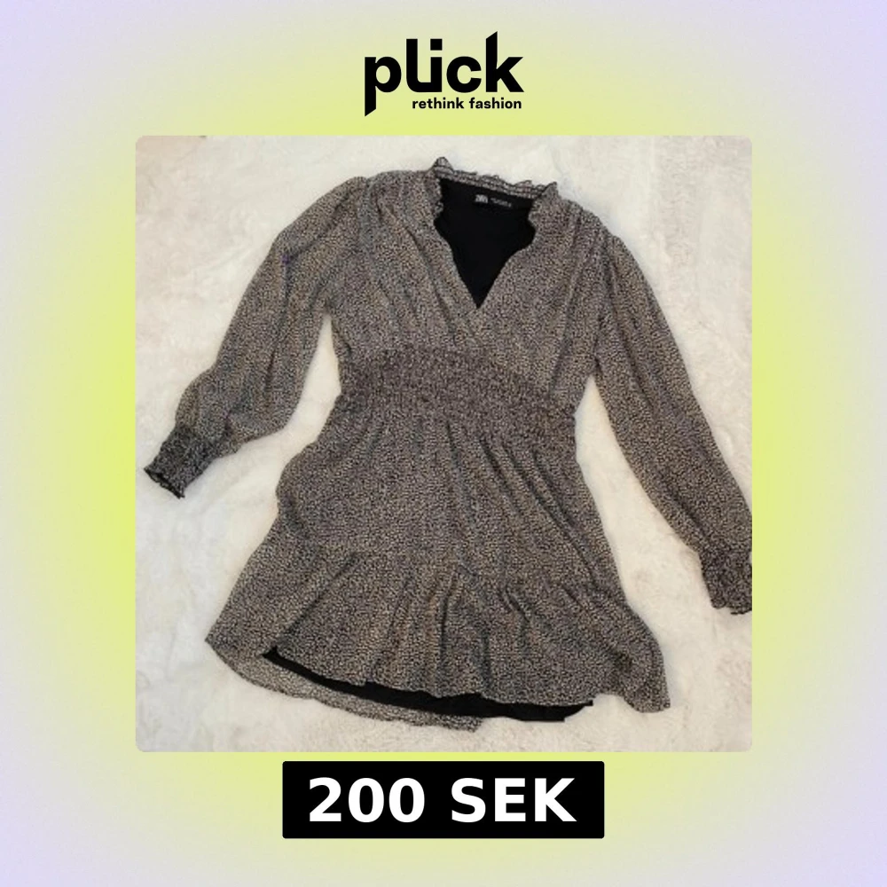 Supersöt kortklänning från Zara i svartvitt småmönstrat tyg. Klänningen har v-ringning, långa ärmar med resår vid handlederna och smock i midjan för en snygg passform. Volang nertill och lätt, luftig.
