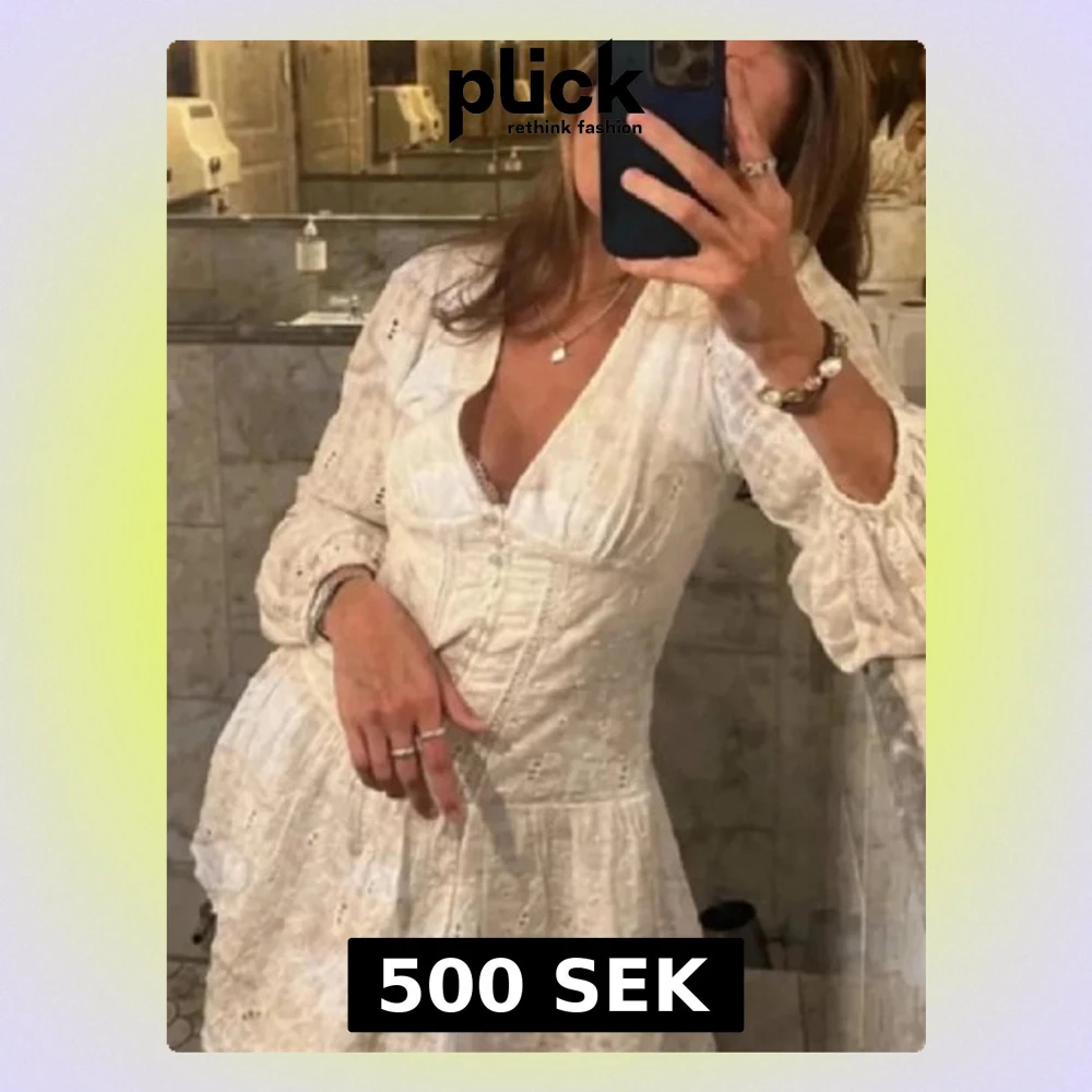 Superfin vit kortklänning med v-ringning och broderade spetsdetaljer. Klänningen har långarm men går ihop vid vristerna. Perfekt för sommaren, student och utomlandsresa.