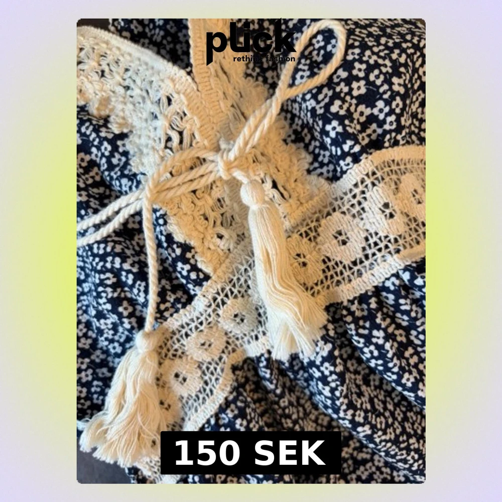 Söt blå klänning med små vita blommor, dekorativa spetsband i vit och knytband med tofsar framtill. Klänningen har smala axelband och omlottinspirerad v-ringning. Perfekt för varma dagar och har en bohemisk känsla. Helt ny