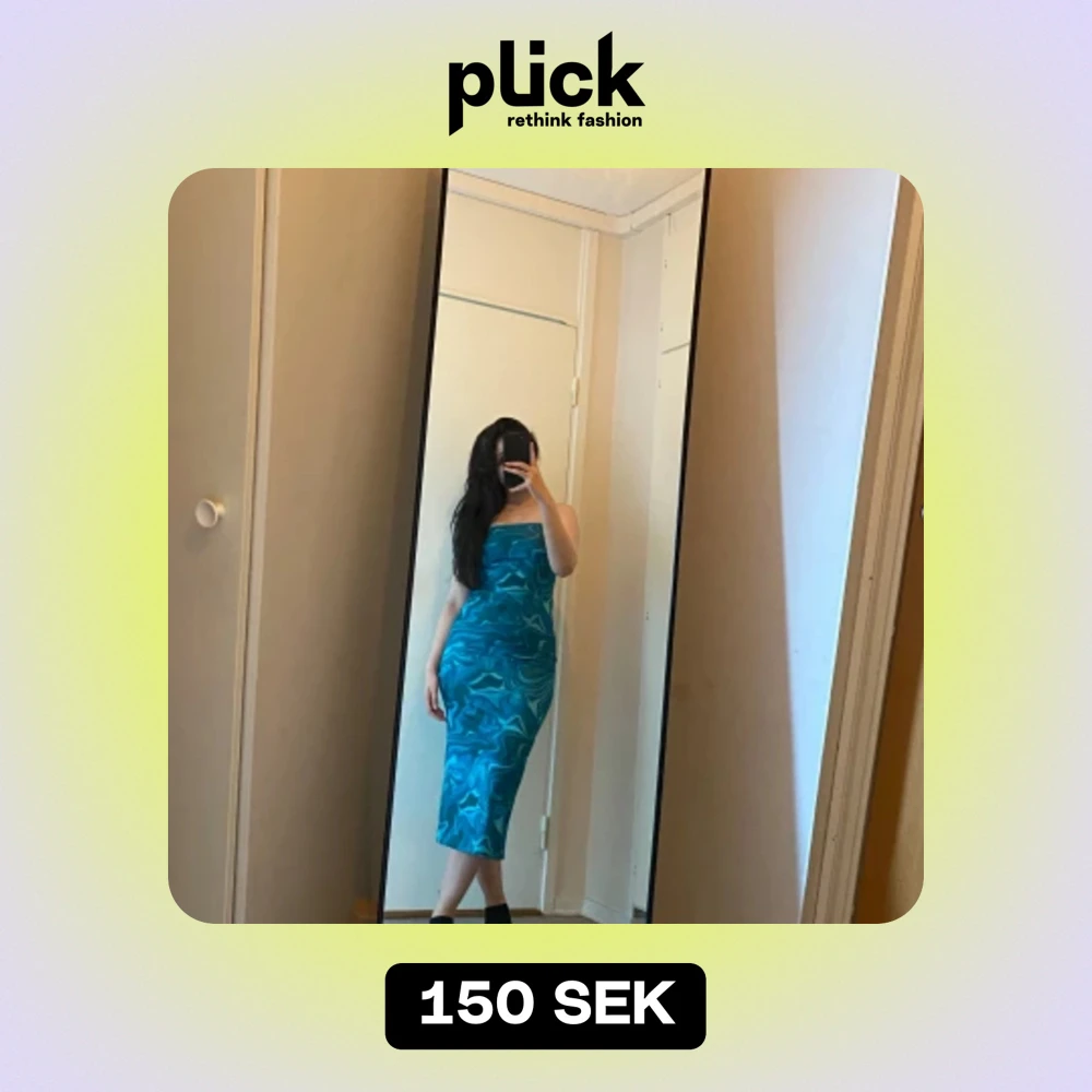 En blå kläningen med olika nyanser av blå. Passar perfekt till sommaren, har en liten öppen rygg och en öppning i slutet.