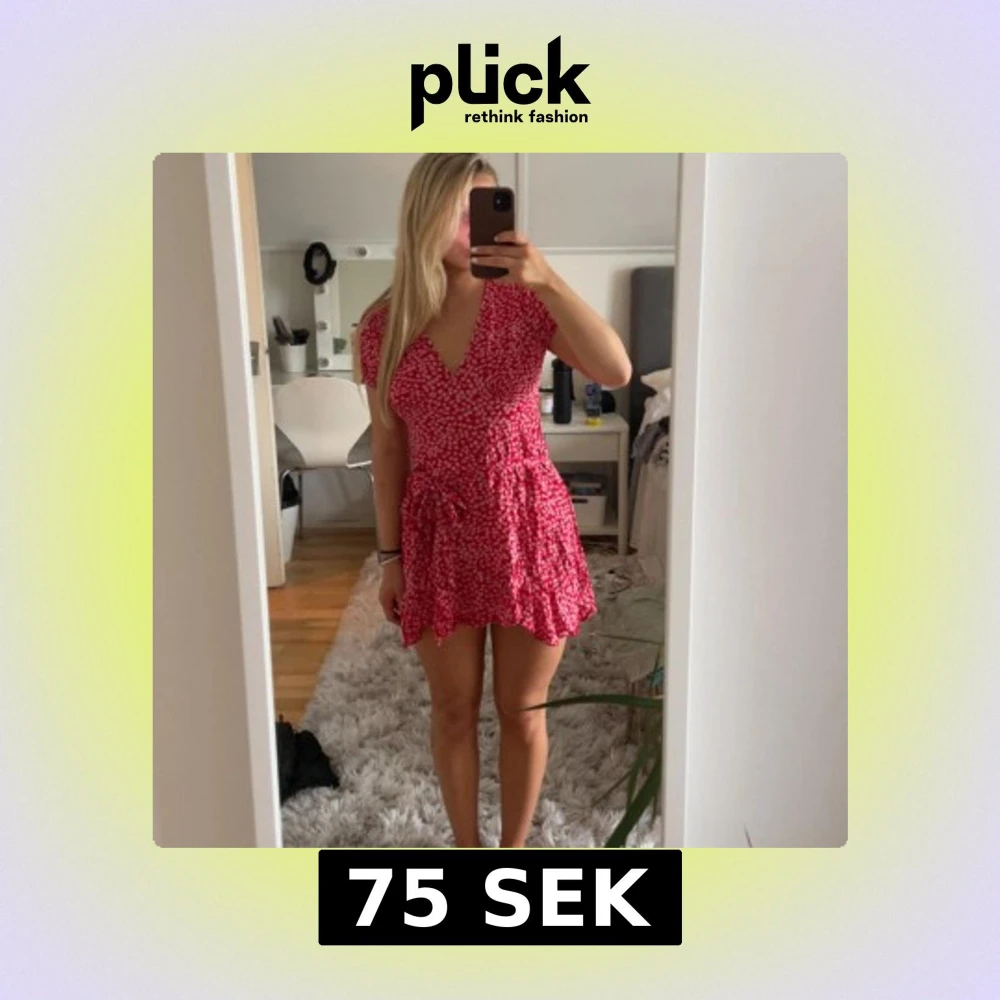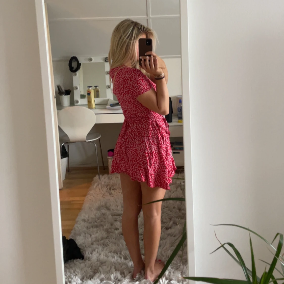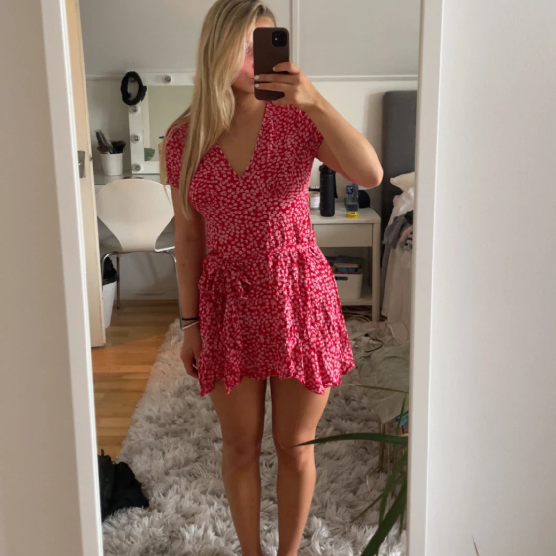 Superfin röd kortklänning med vitt blommigt mönster och volangkant. Perfekt för sommarens alla tillfällen, riktigt söt och trendig stil. Använd några gånger men inga synliga skador. Ena hålet där snöret ska gå igenom har lossnat, men det finns kvar på ena sidan, (se bild). Klänningen är ganska kort i modellen så skulle säga att den är mer som än XS/S än M.