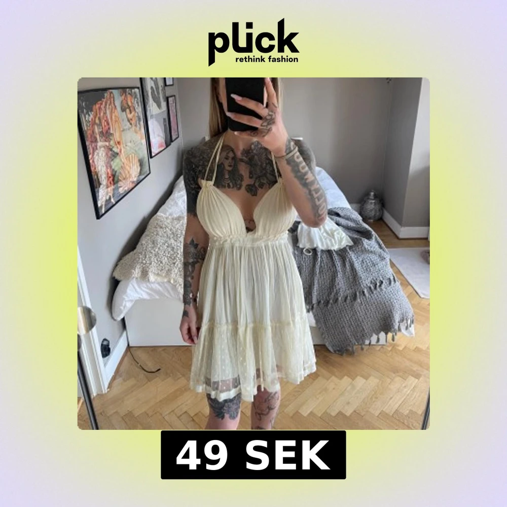 Supersöt cremefärgad klänning med volangdetaljer och knyt i ryggen. Klänningen är ärmlös, har djup v-ringning och är sydd i ett tunt, lätt material med diskret prickigt mönster på kjolen. Har små fläckar som inte syns alls vid användning (se bilder) passar allt från xs-L då man drar in den med snören. Jag har xs vanligtvis för referens på bilderna