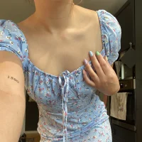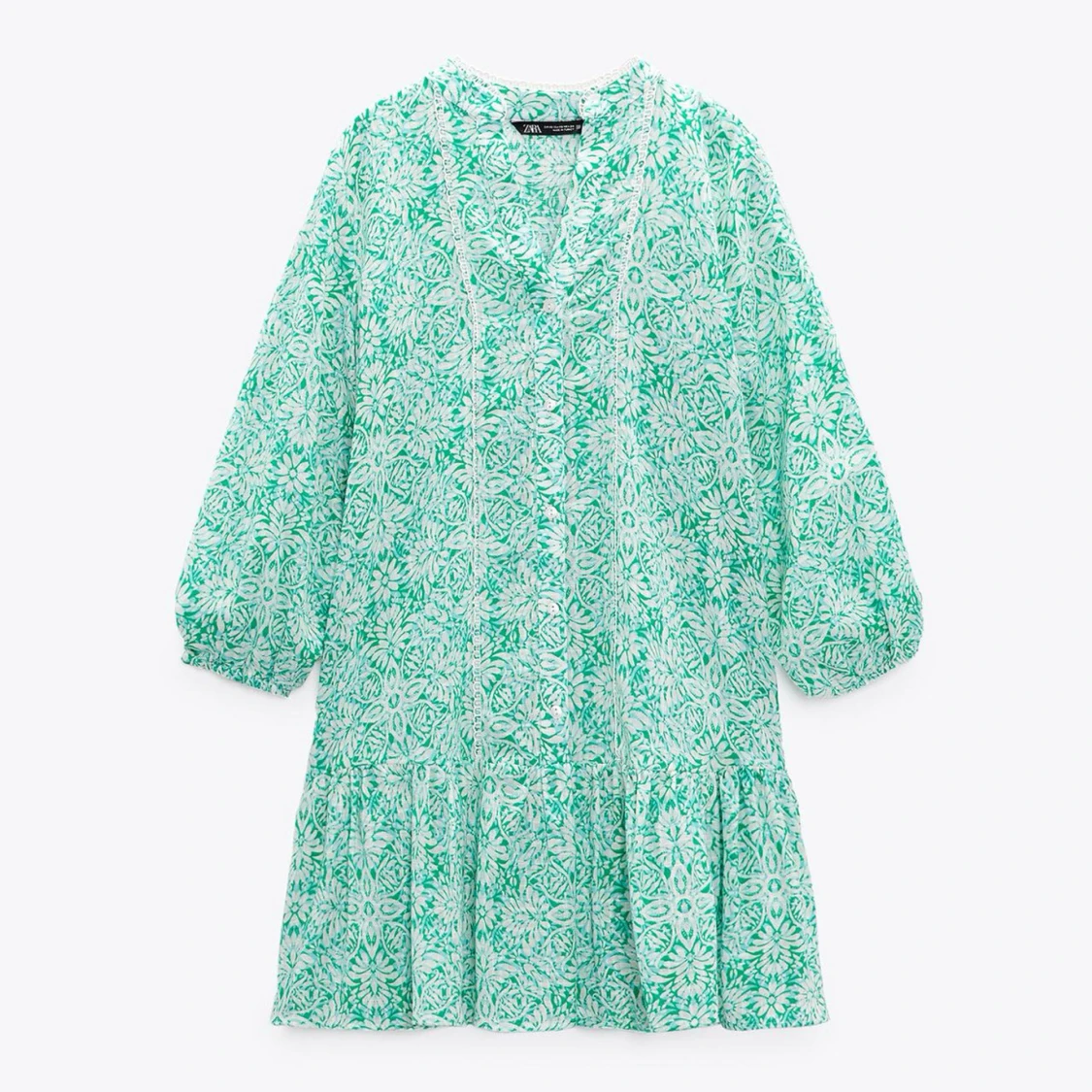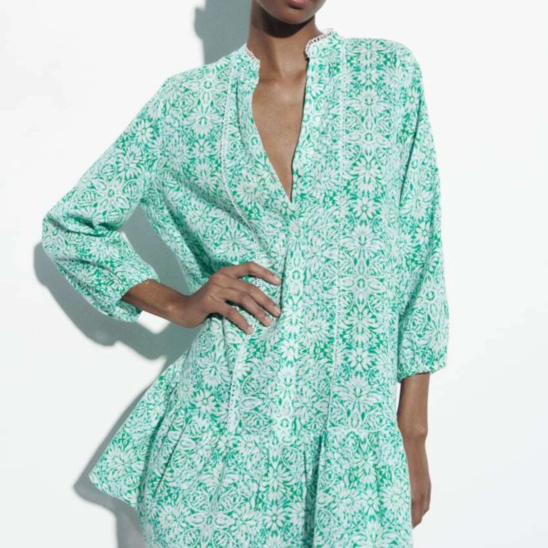 Snygg grön klänning med blommigt mönster och trekvartsärmar. Perfekt till sommaren! Säljes då den inte kommer till användning längre, bra skick.