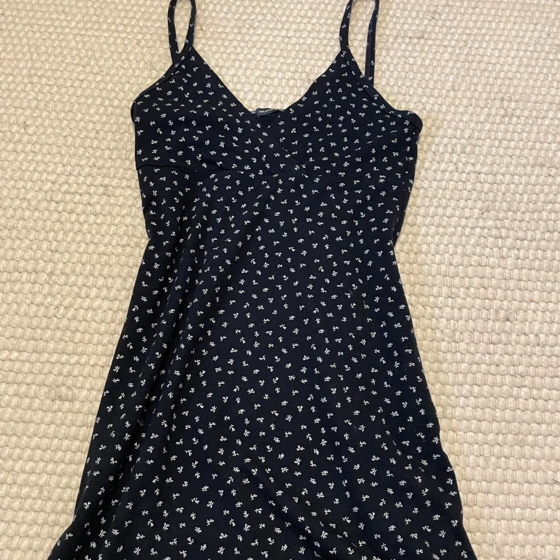 Säljer en superfin svart klänning från Brandy Melville med små vita blommor. Den har en v-ringad design och smala axelband, perfekt för sommardagar eller en festkväll. Klänningen är i nyskick och har en tight passform som framhäver figuren.