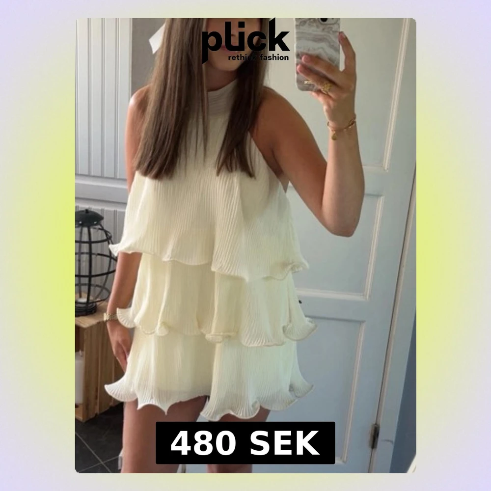 Säljer en ljusgul kortklänning med flera lager volanger och hög hals. Klänningen är ärmlös och har ett luftigt, plisserat tyg som ger en snygg och modern look. Perfekt för sommarens alla tillfällen.