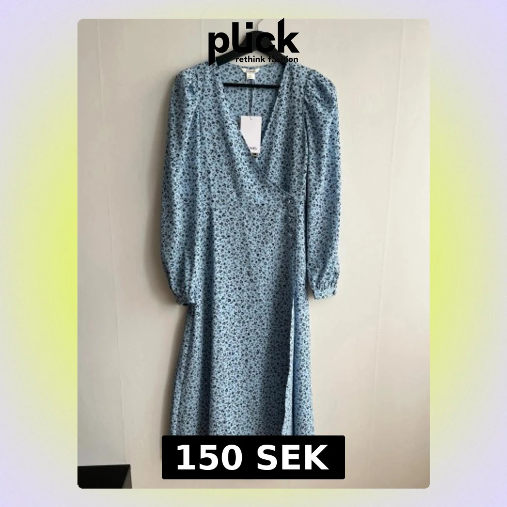Säljer en ljusblå omlottklänning från Monki med svart blommigt mönster. Klänningen har långa puffärmar, v-ringning och knyt i midjan. Perfekt för vår och sommar, tillverkad i ett mjukt och lätt material. Sitter tajt runt midjan men lös i armer och kjolen. Aldrig använd!