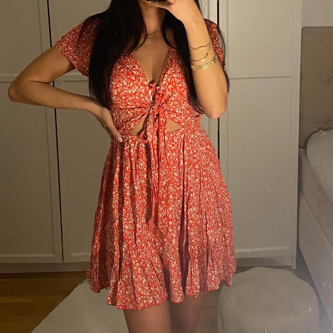 Blommig röd klänning. Med knyte framme vid brösten. Passar s/m