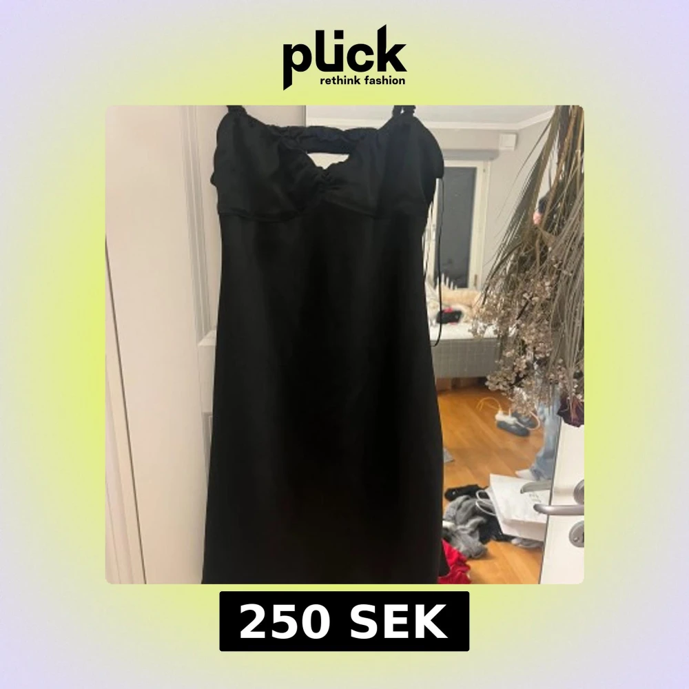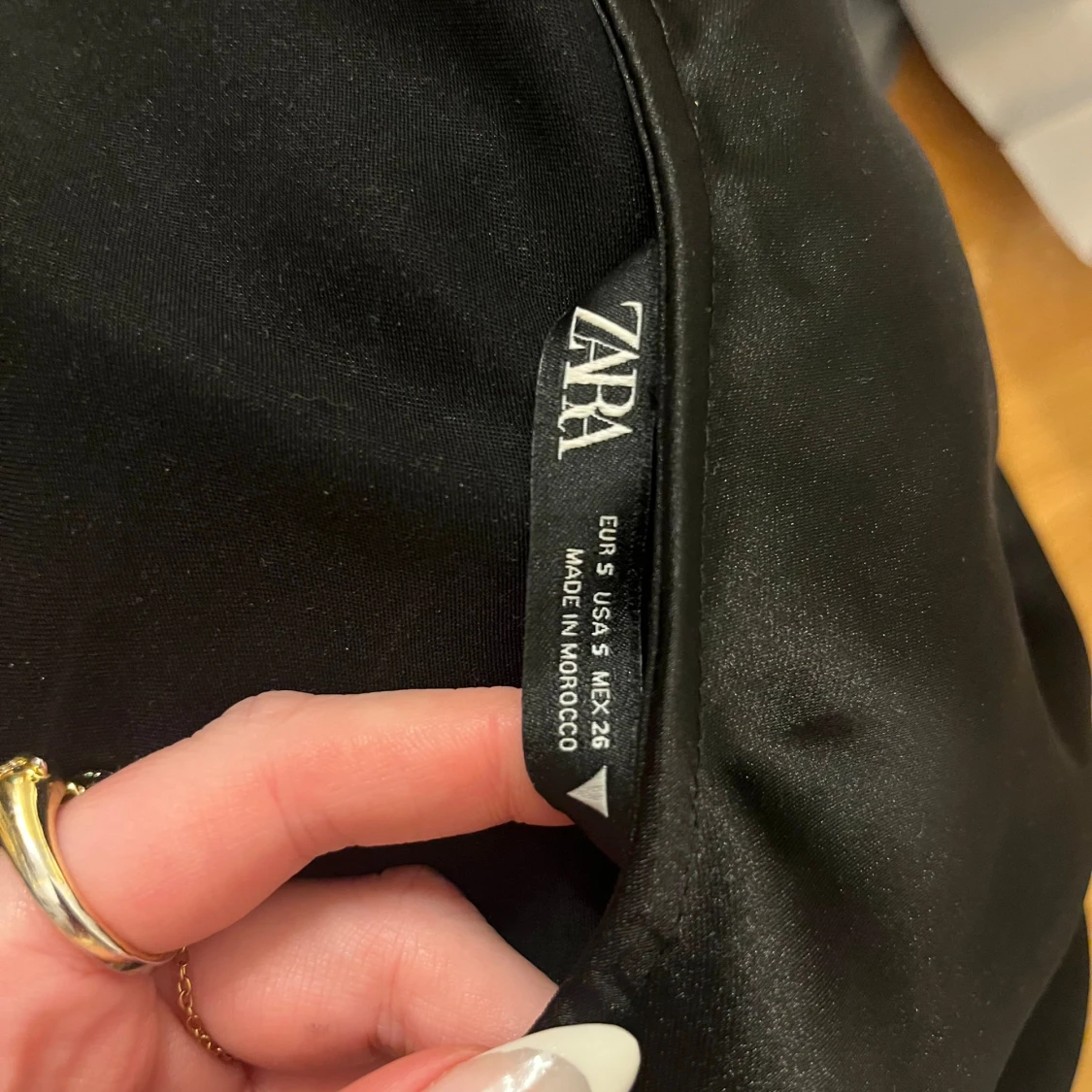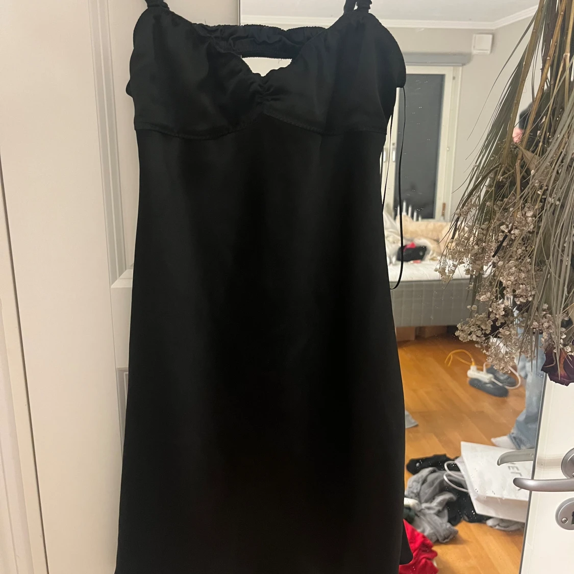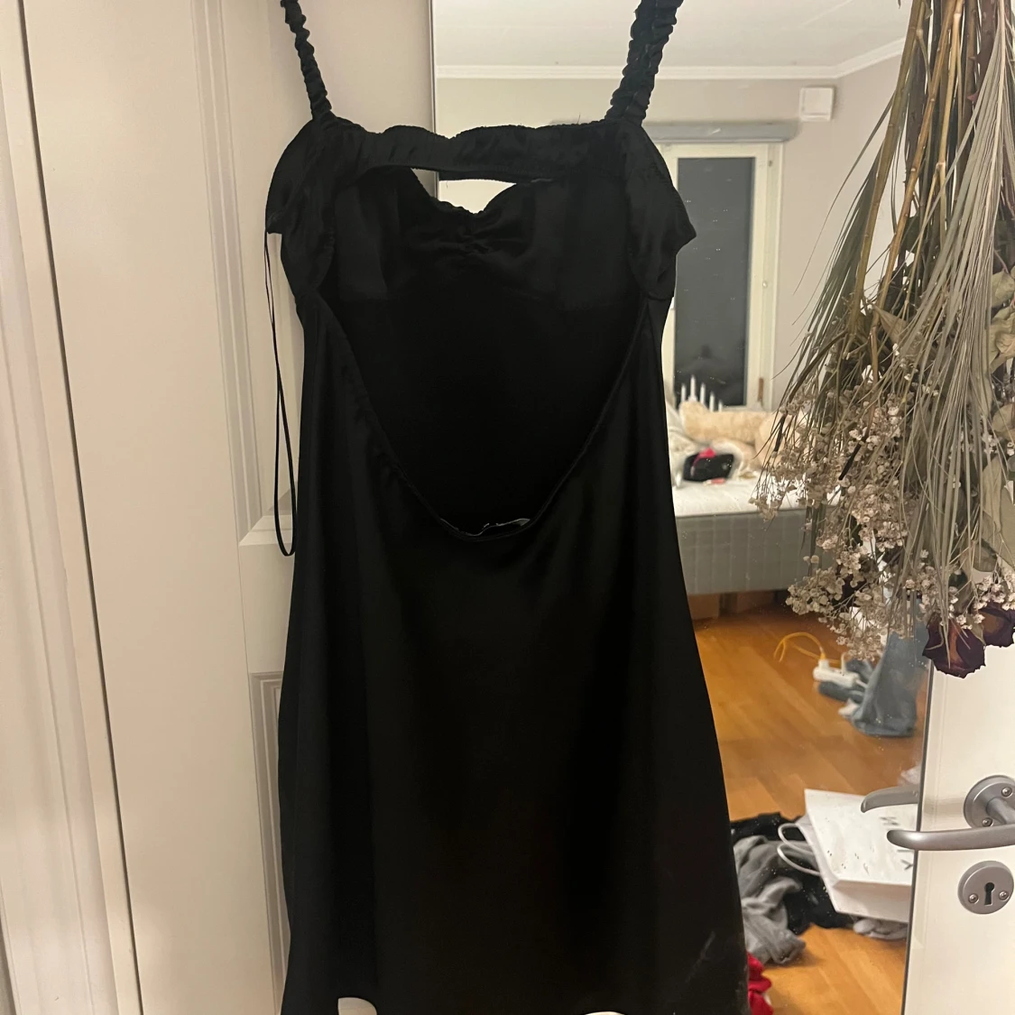 Snygg svart kort klänning från Zara i satinmaterial. Klänningen har smala axelband, en lätt rynkad byst och en öppen rygg med snygg detalj. Säljer då jag aldrig använder, den är ifrån Zara i storlek 36 och passar bra för mig som är 1,73.