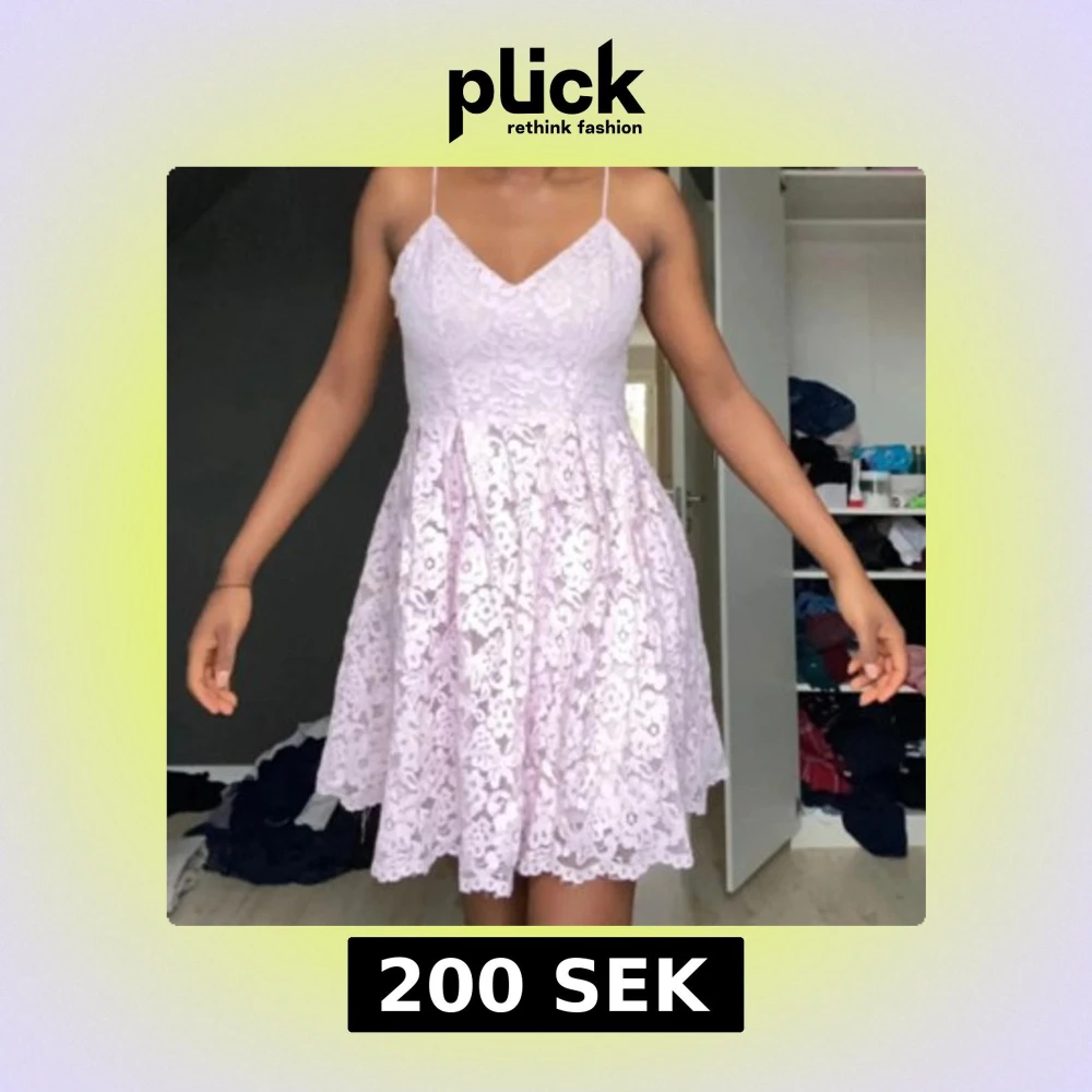 Charmig ljusrosa klänning i spets med smala axelband och v-ringad hals. Perfekt för sommarens festligheter med sin korta längd och romantiska stil.