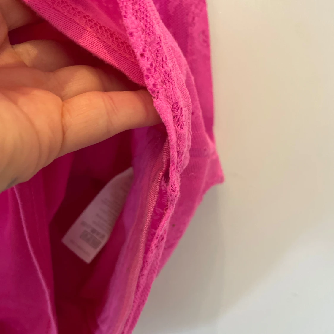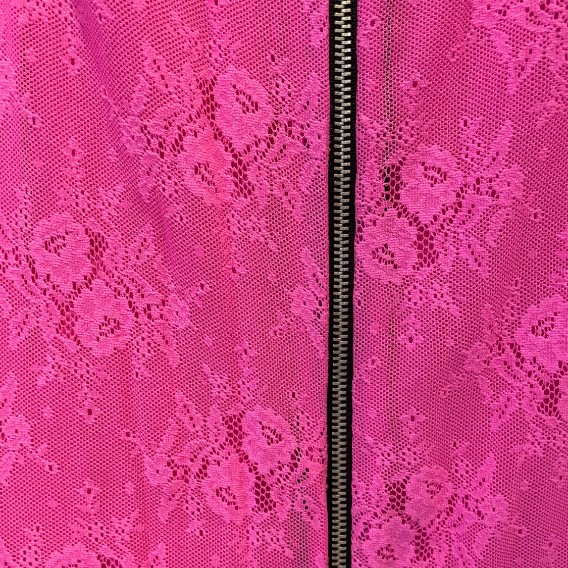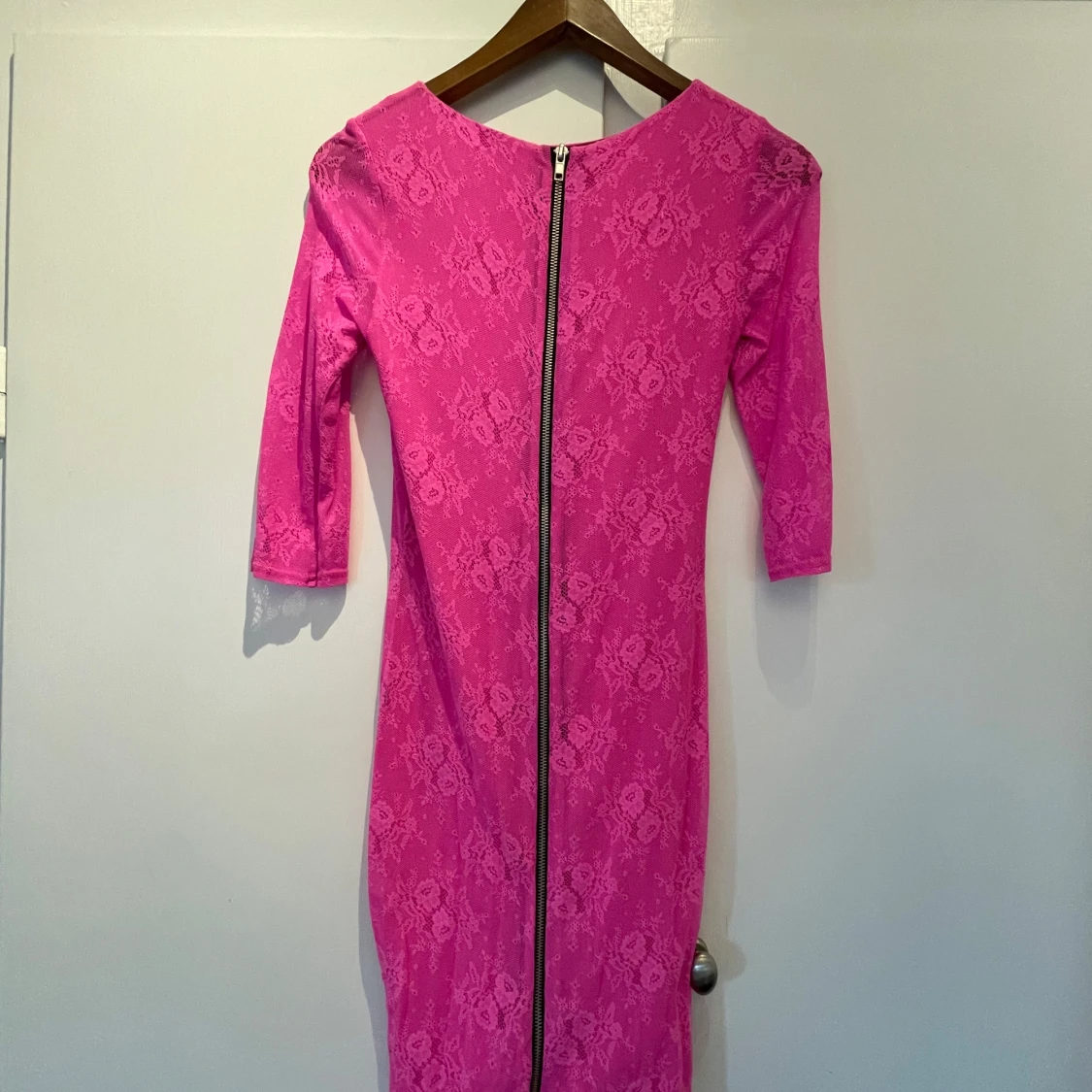 Säljer en rosa klänning med blommig spets och trekvartsärm. Klänningen har en lång dragkedja bak och är figurnära i modellen. Perfekt för dig som vill sticka ut med färg och detaljer!