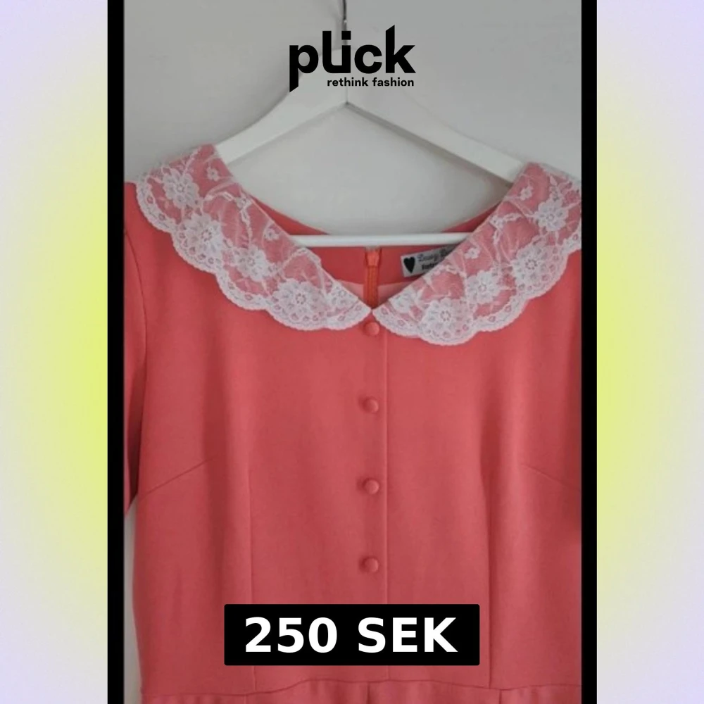 jus rosa/korallfärgad klänning med en vit spetskrage och dekorativa knappar framtill. Klänningen har korta ärmar och en figurnära passform som sedan faller ut i en subtil trumpetkjol. Dragkedja baktill.