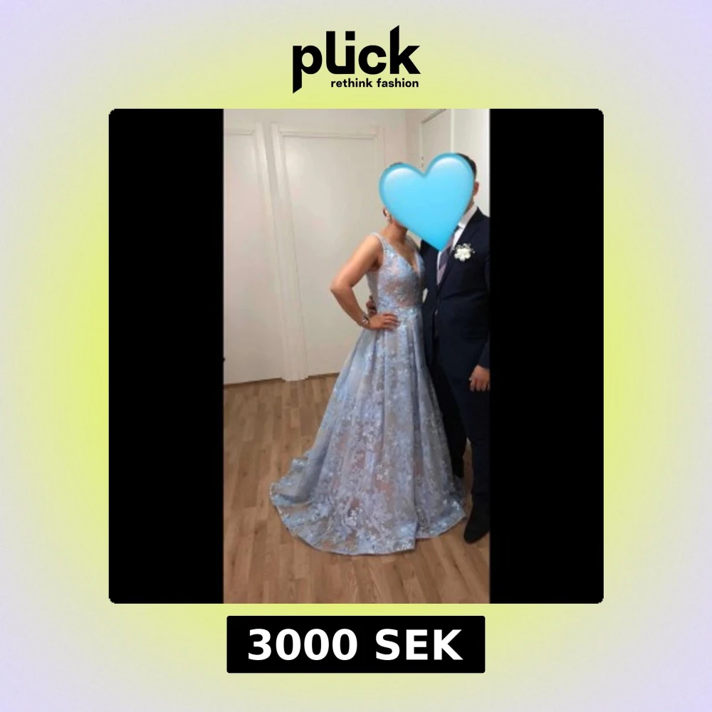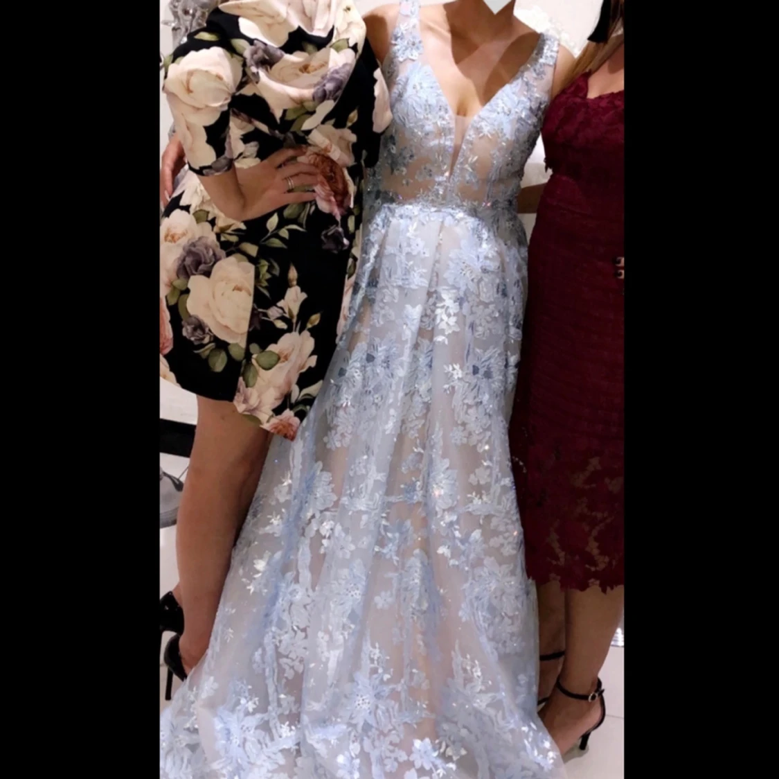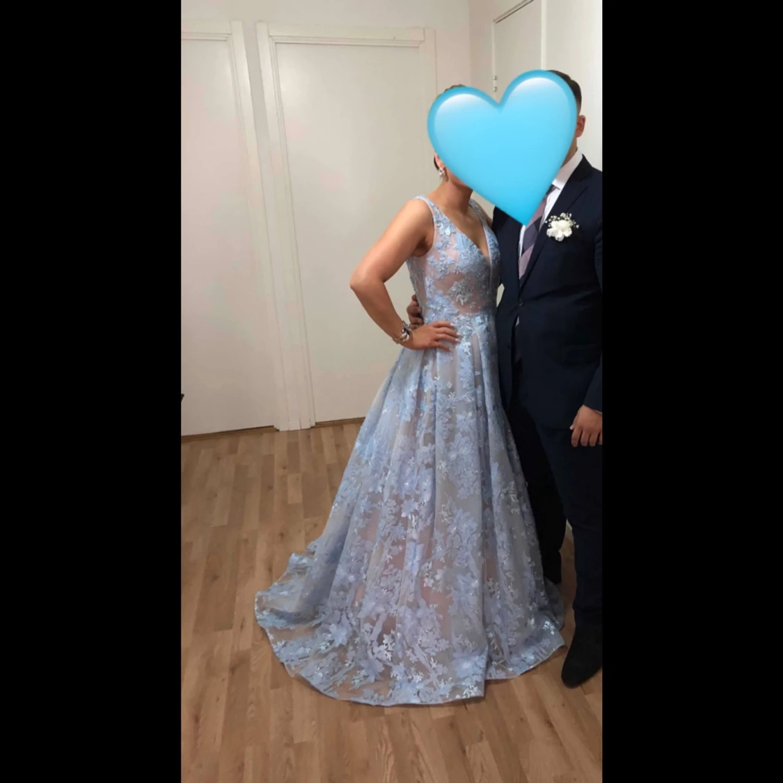 Säljer en ljusblå långklänning med v-ringad hals och breda axelband. Klänningen har spetsdetaljer. Perfekt nu inför balen eller bröllop. Köptes för 8000kr och har endast använts vid ett tillfälle och är i nytt skick och har inga defekter alls.
