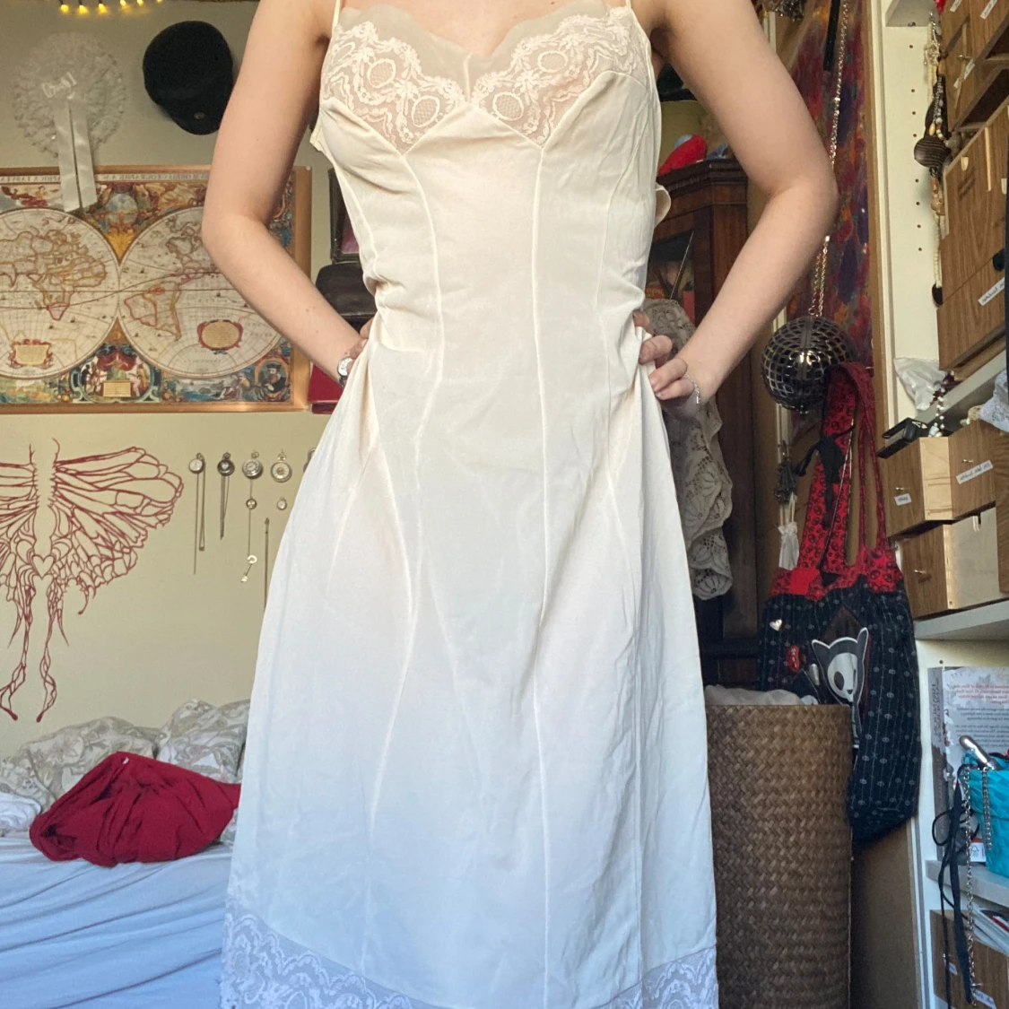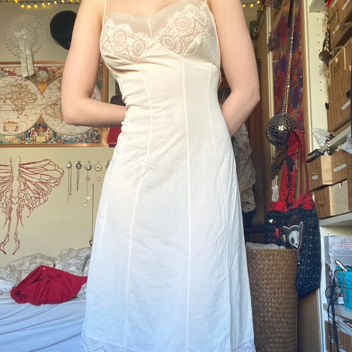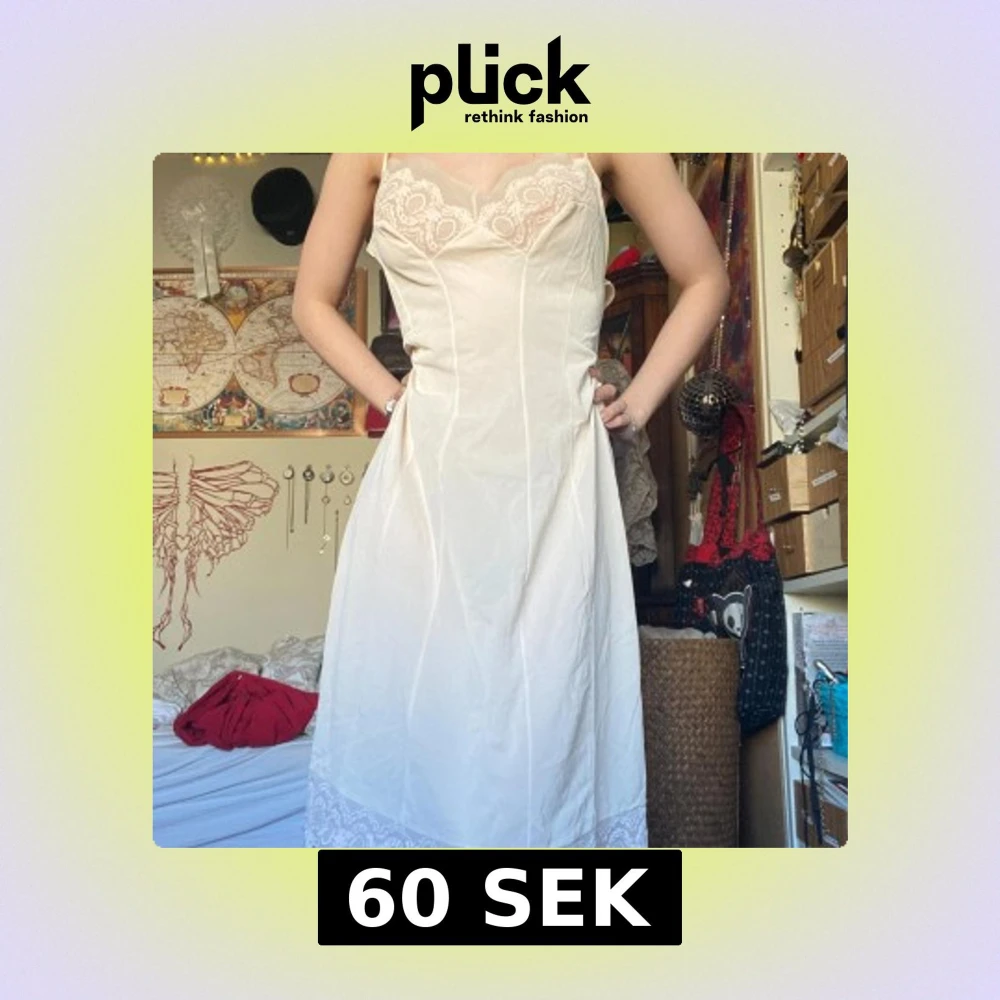 vit / offwhite klänning / nattlinne med smala axelband spetsdetalj vid bysten och nedtill. somrig och mjuk (: liten fläck baktill. stl L