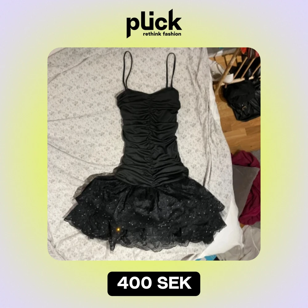 Svart klänning i mjukt material och spets med diamanter nedtill🥰jättefin! Står att de är storlek 40 men skulle säga att den passar från S till L då det är stretchigt material❤️❤️Inga defekter