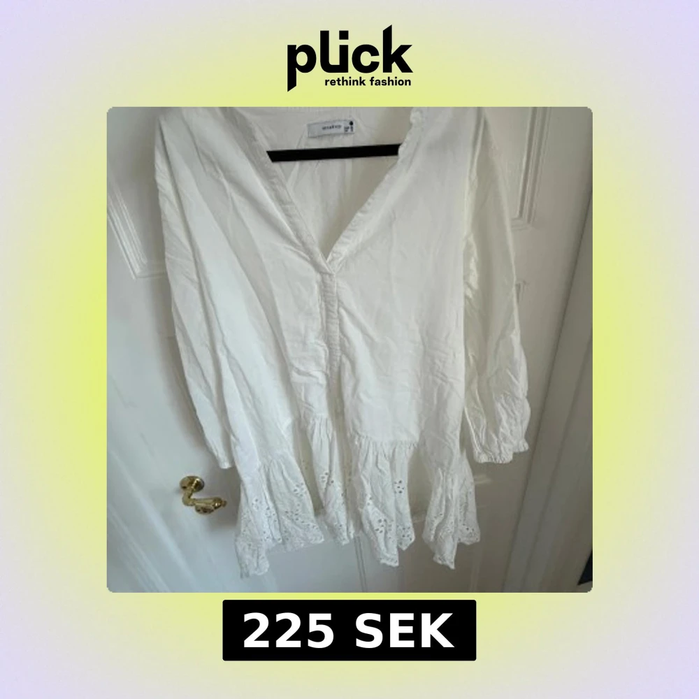 Supersöt vit sommarklänning från Reserved i storlek 38. Klänningen har v-ringning, långa ärmar med resår vid handlederna och volangkant med broderad spets längst ner. Tyvärr för kort på mig