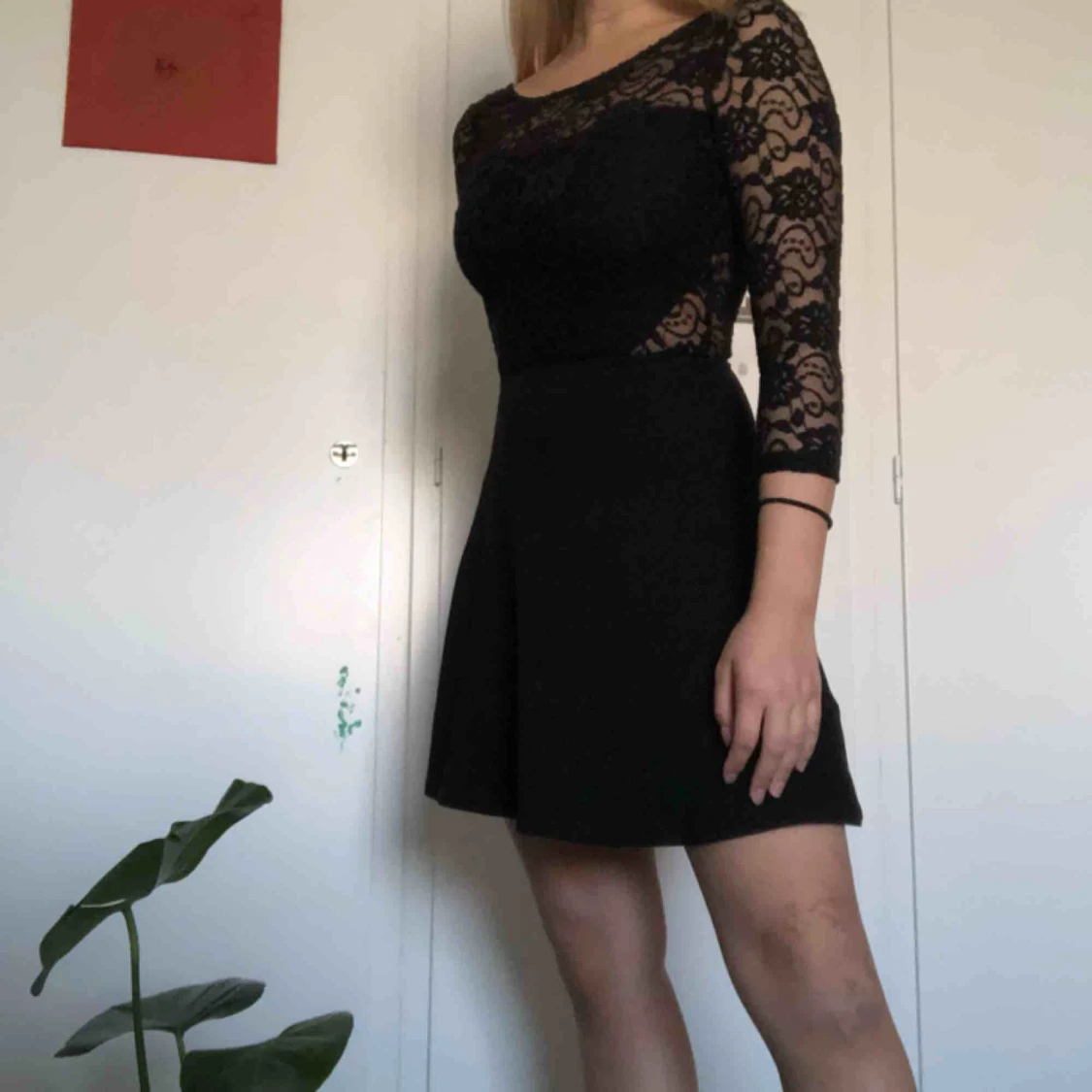 Fin svart klänning med spets på överdelen samt dubbelt lager tyg vid brösten och magen. Lite stretchig, trekvarts långa ärmar, lite tajt på överdelen som formar midjan lite. Går ner till lite ovan knäna, jag är 160cm lång.