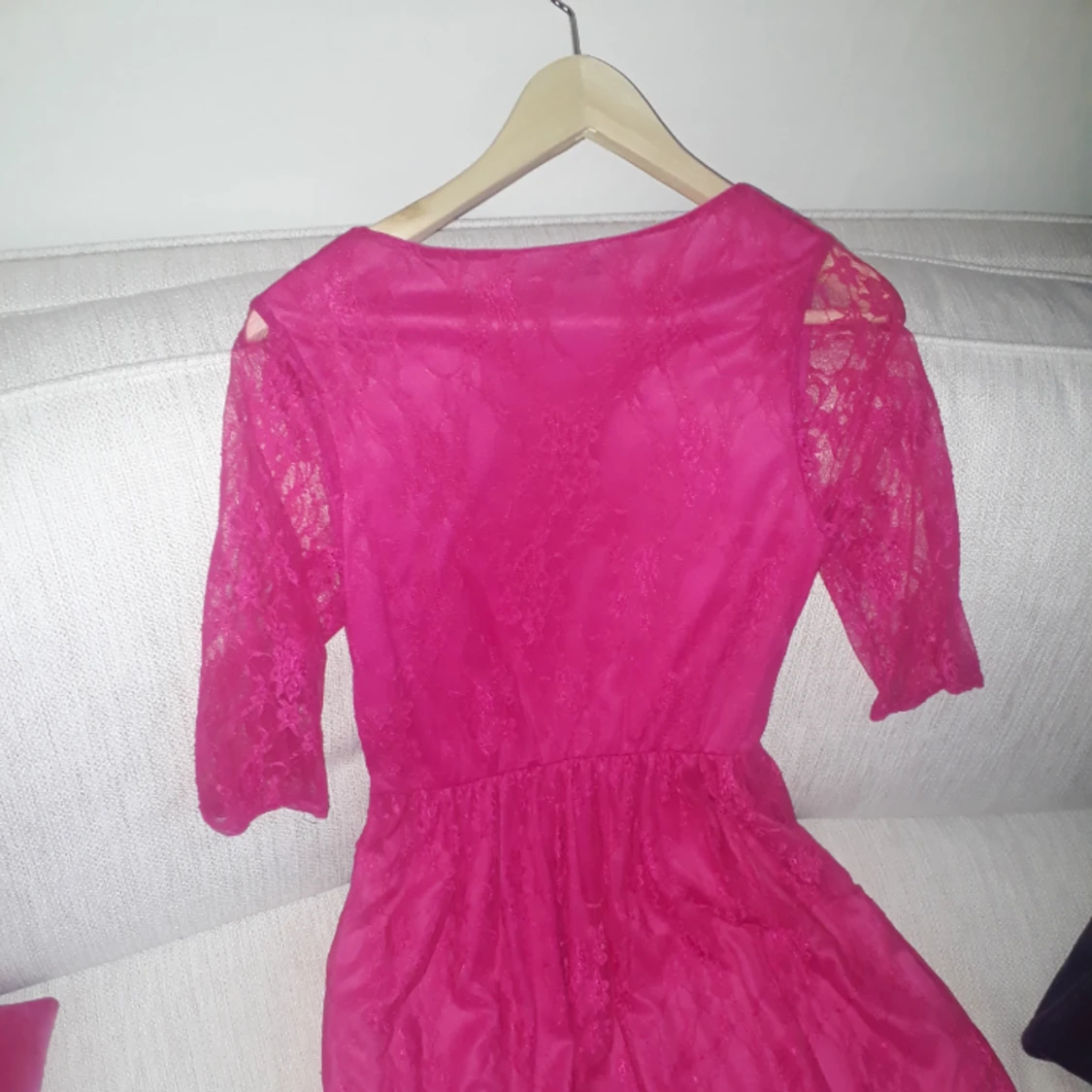 En rosa/röd klänning som sitter snyggt. Slutar strax innan knäna. Fin spets som gör den extra lyxig.