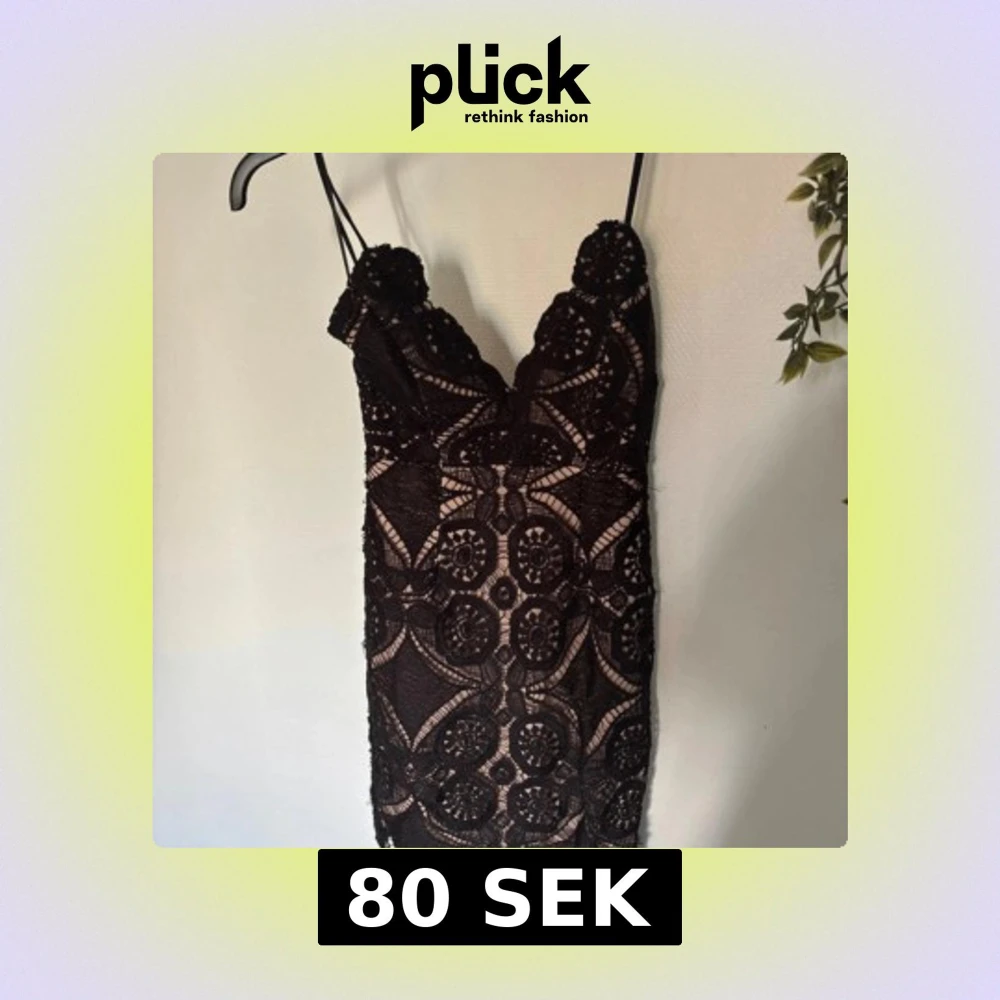 Kort klänning med spets och smala axelband. Djup v-ringning och figurnära passform. Aldrig använd