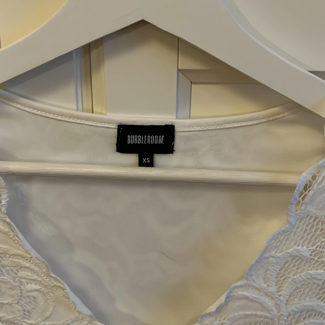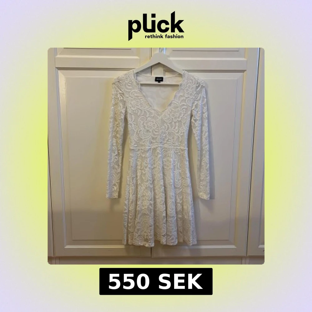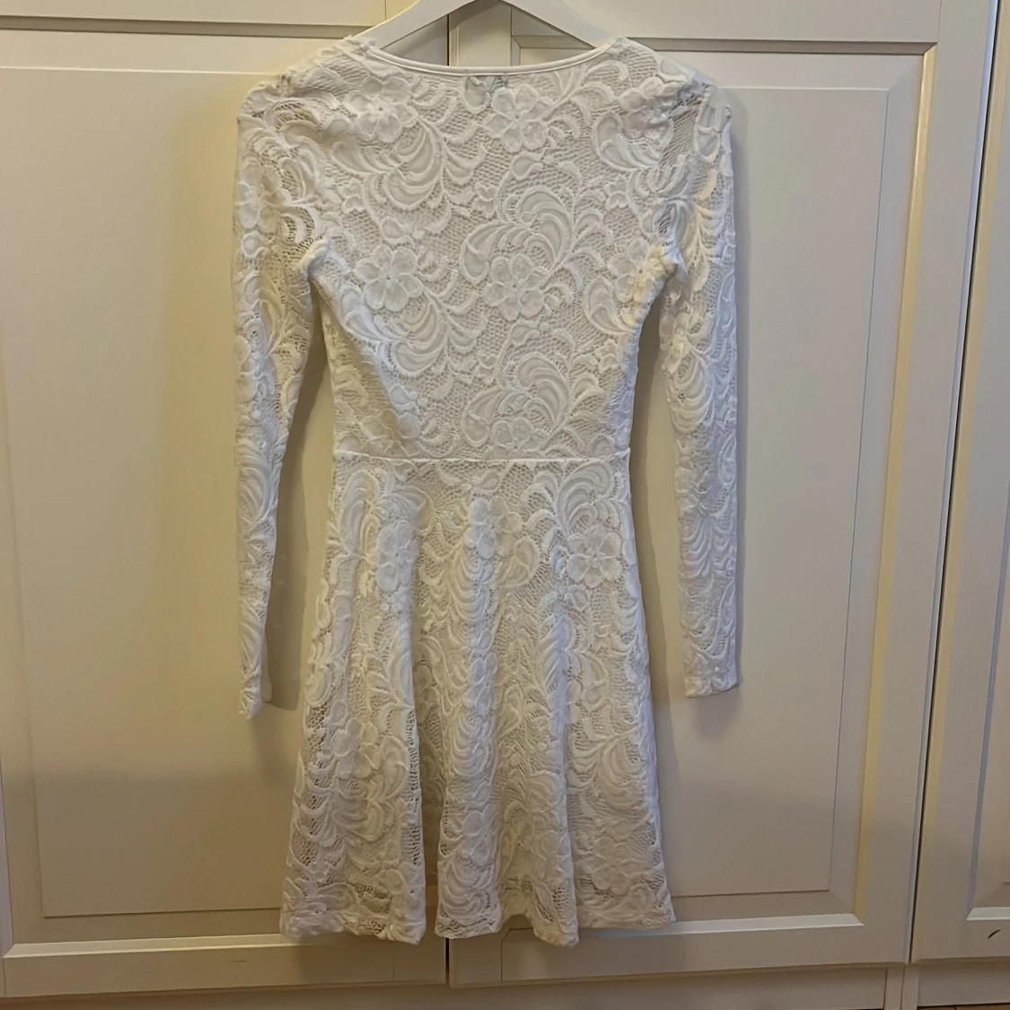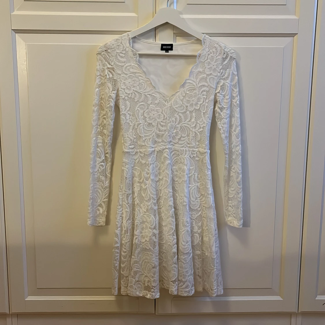 Superfin vit kort spetsklänning från Bubbleroom med lång ärm och v-ringning. Klänningen har ett blommigt spetsmönster och är fodrad undertill. Har bara använt en gång på en skolavslutning så den är så gott som ny! Köpt för 750kr 🥰