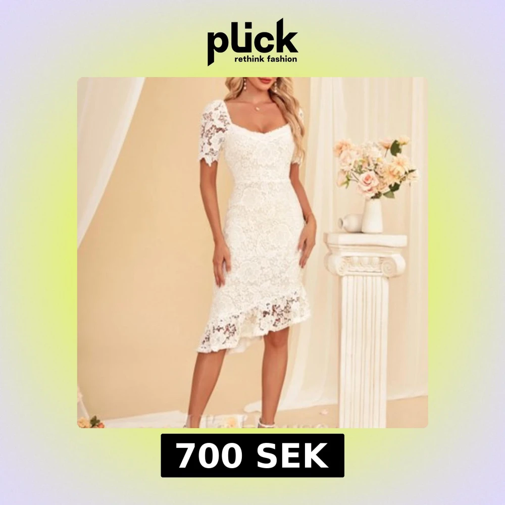 Superfin vit spetsklänning med figurnära passform och kort ärm. Klänningen har v-ringad urringning, volangdetalj nertill och vackert blommigt spetsmönster. Perfekt för sommarens alla tillfällen när du vill känna dig extra söt och chic. Klänningen är helt ny och oanvänd, prislappen sitter kvar!