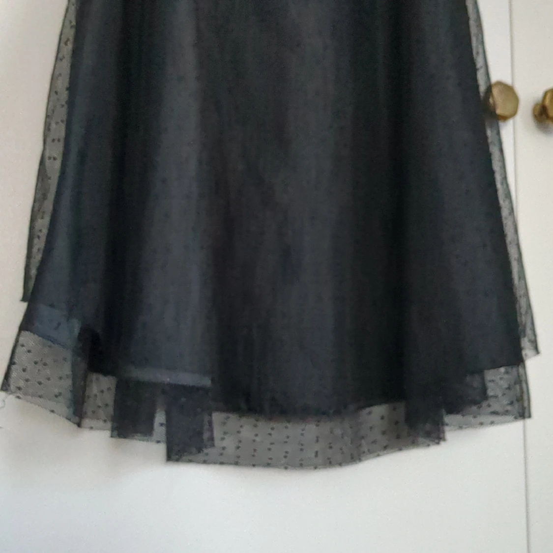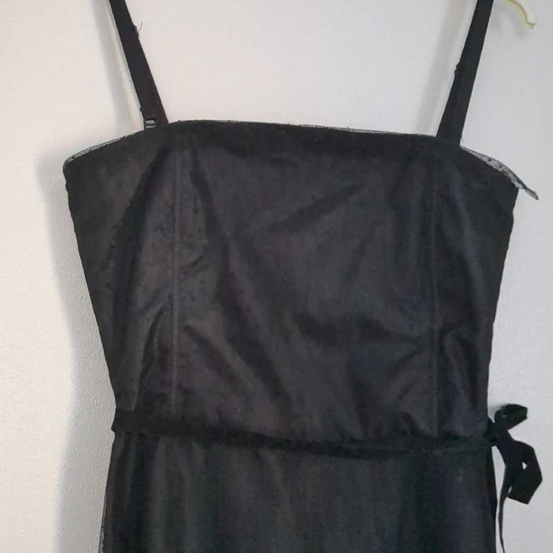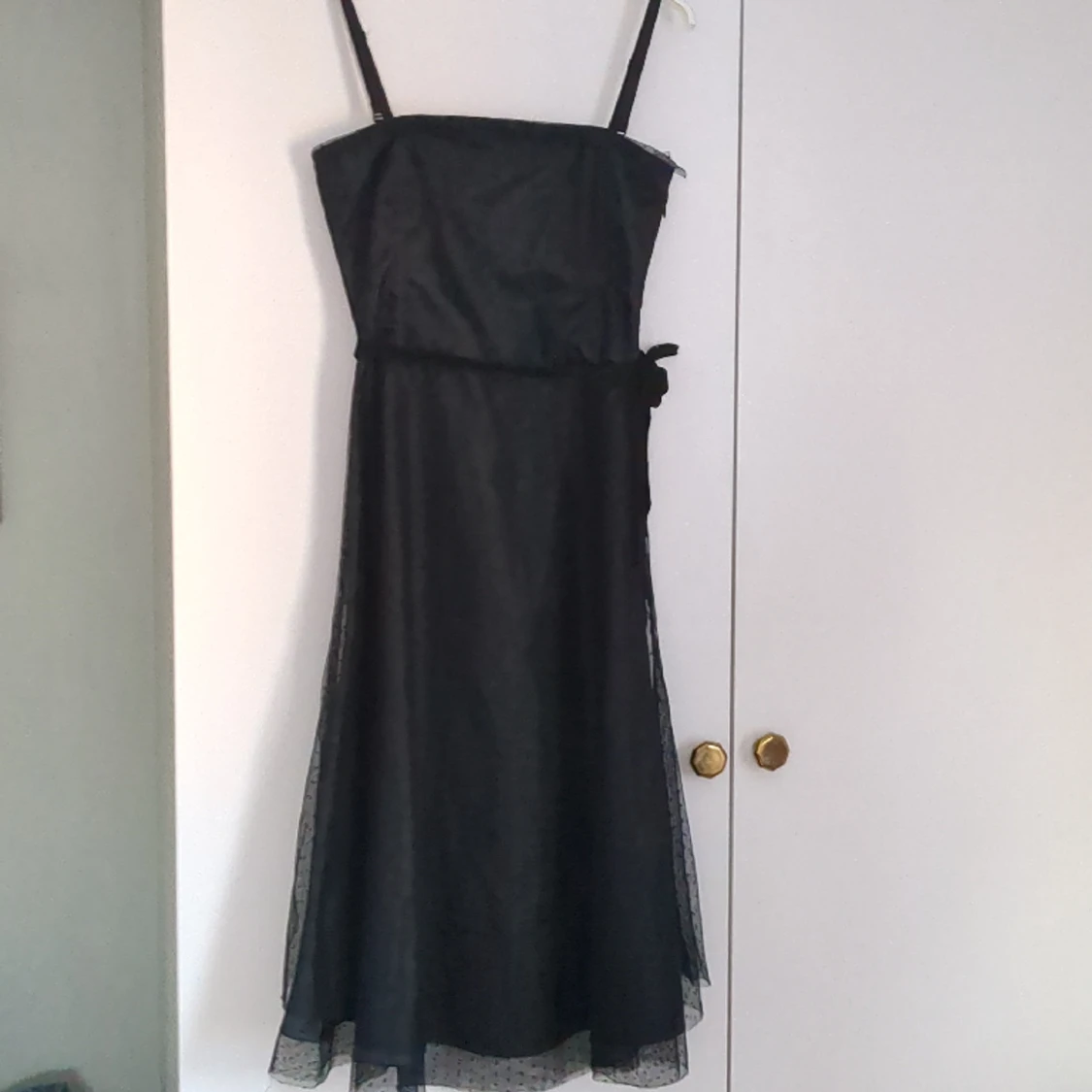Vacker svart klänning med spets. Snöret är lite trasigt på ett ställe men syns knappt. Annars i nyskick.