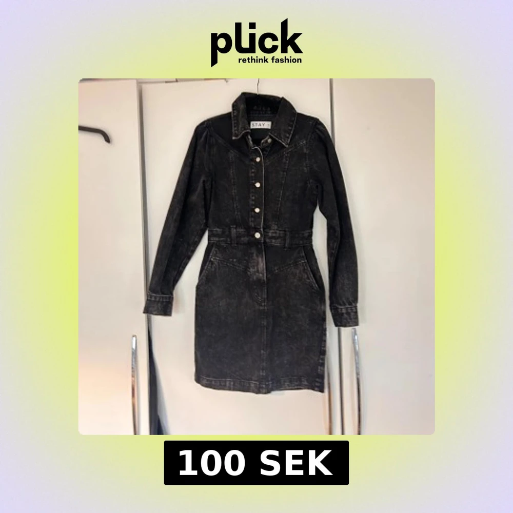 Snygg svart jeansklänning från Stay med knappar framtill, puffiga ärmar och ett bälte i midjan. Klänningen har långa ärmar och en klassisk krage. Perfekt för en cool och avslappnad stil.