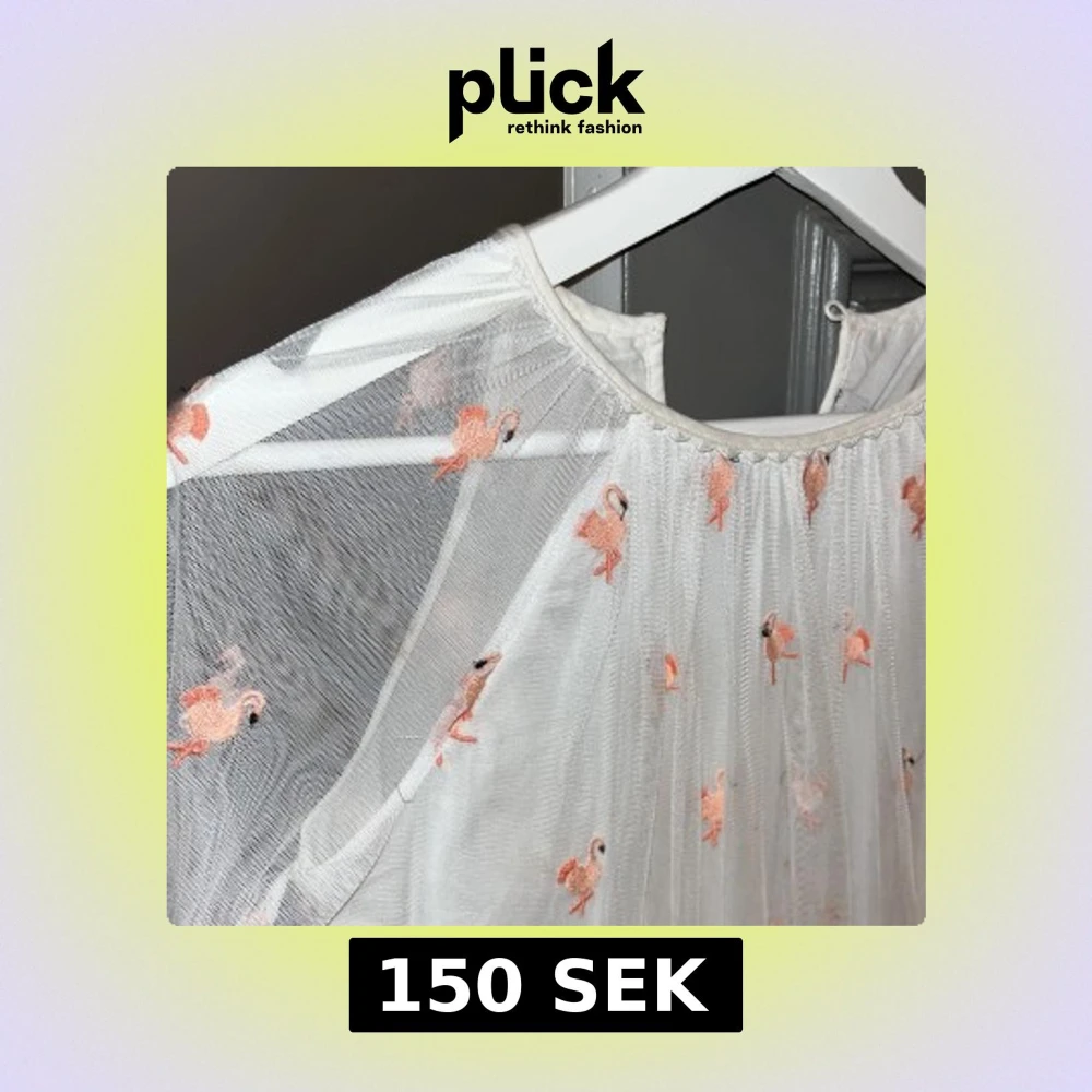 Charmig vit klänning med ett genomskinligt lager och broderade flamingor i rosa. Klänningen har långa ärmar och en luftig passform, perfekt för en somrig look. Den har en rund halsringning och ett lätt fall som ger en romantisk känsla.