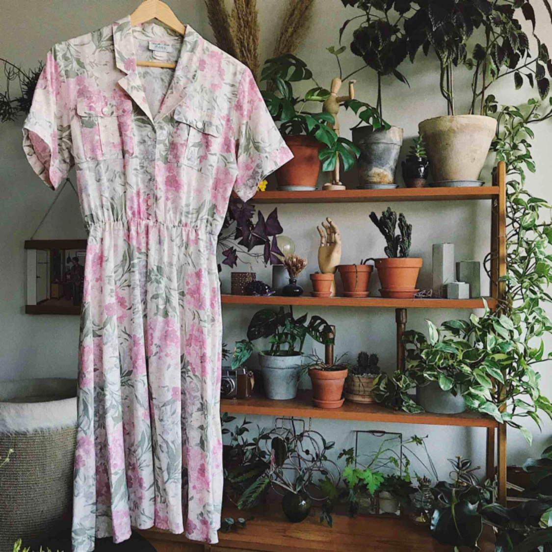 Härlig vintageklänning med fickor (nere vid händerna också utöver bröstfickorna!) Ingen bestämd storlek men skulle gissa på 36/38, även jag som ligger mellan 38/40 kan ha den. Köparen står för frakt, kan eventuellt mötas upp i Stockholm också!
