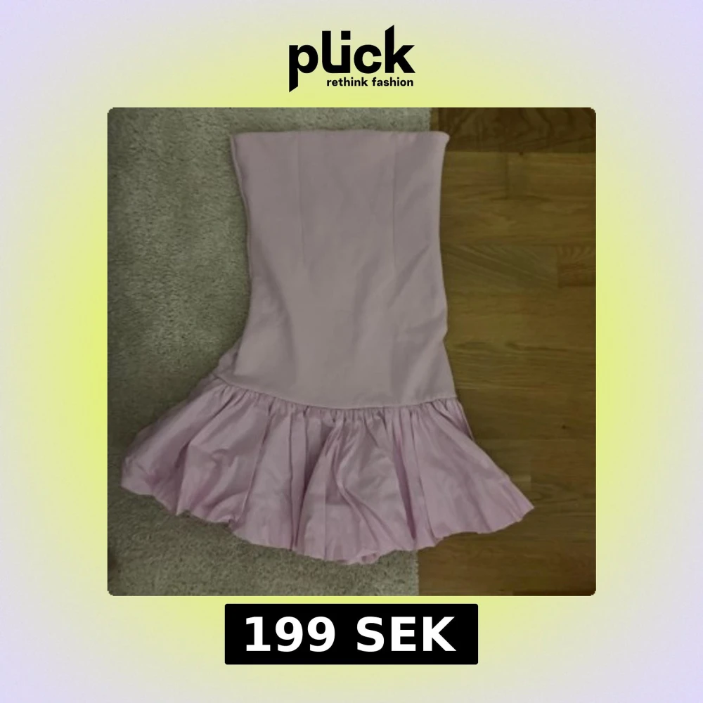Supersöt axelbandslös kort klänning i ljusrosa med volang nertill. Klänningen har en figurnära passform upptill och en fluffig, rynkad kjol som ger en lekfull vibe. Perfekt på sommaren!!