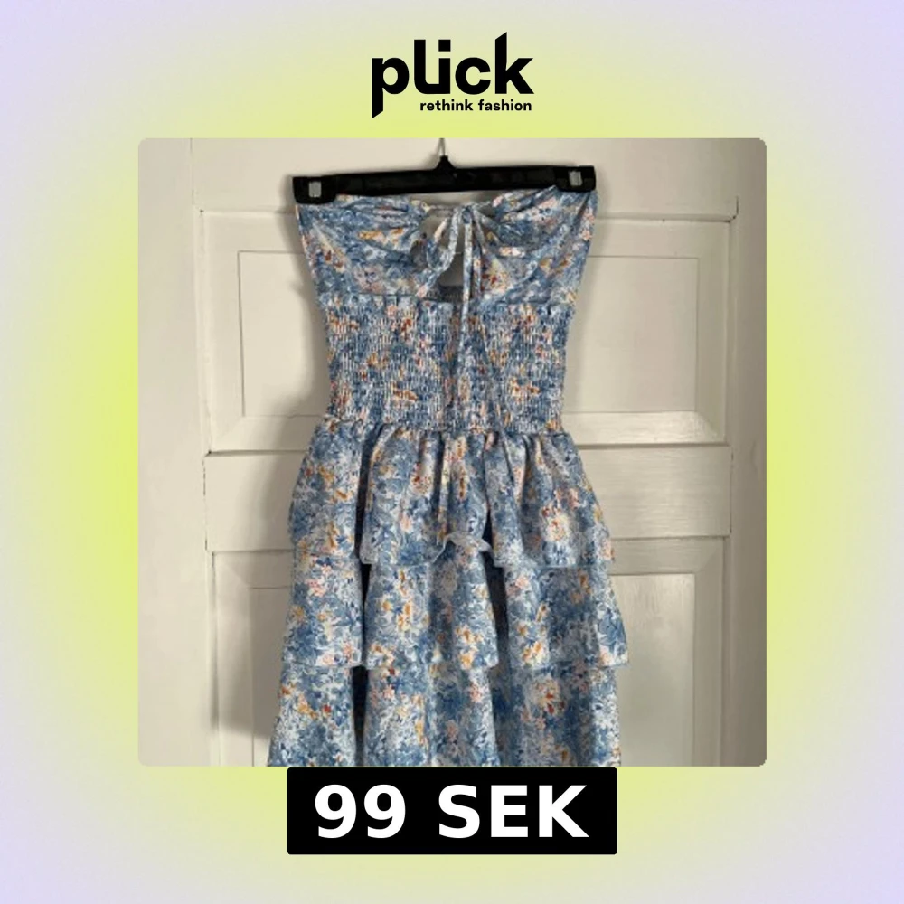 Supersöt kort klänning i ljusblått med blommigt mönster och volanger. Perfekt för varma dagar och ger en romantisk vibe. Går att knyta på olika sätt. Pris kan diskuteras