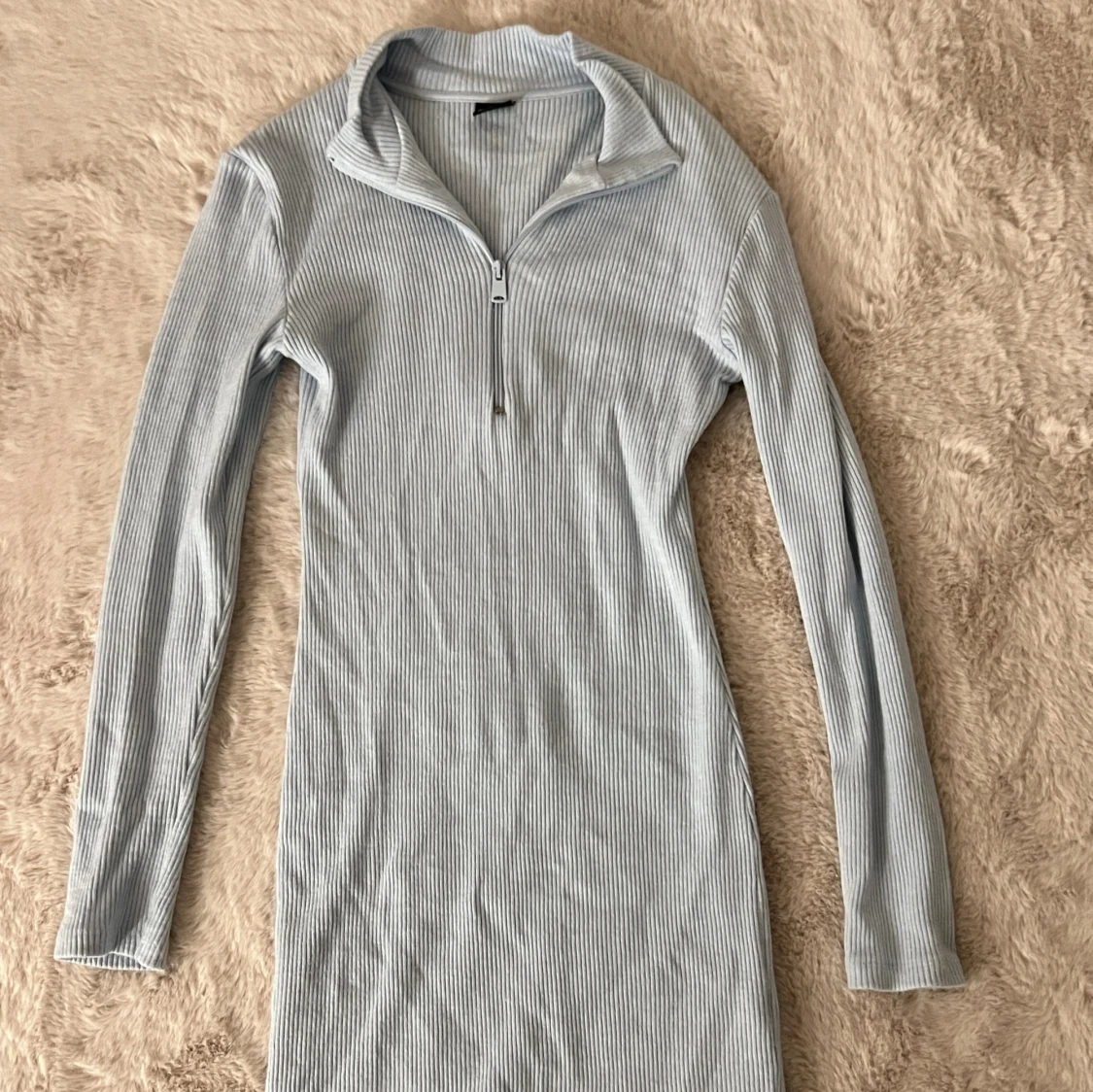 En blå stickad klänning. Slutar ovanför knäna