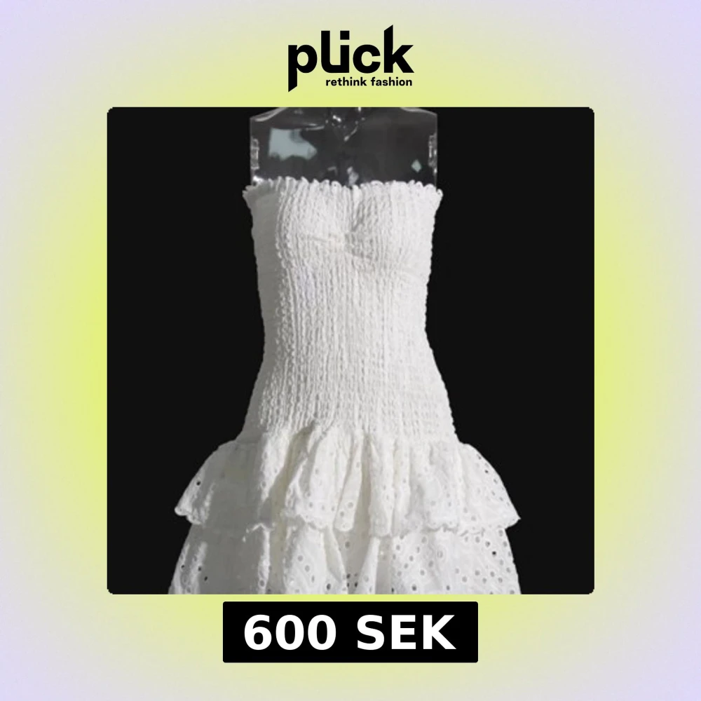 Supersöt vit kortklänning med smockad överdel och axelbandslös design. Kjolen har två lager volanger med broderade hål och spetsdetaljer. Perfekt för sommarens alla tillfällen, ger en fräsch och najs sommar vibe. Köpte för 850kr, pris kan diskuteras 💗