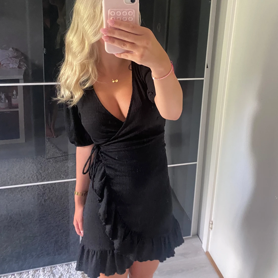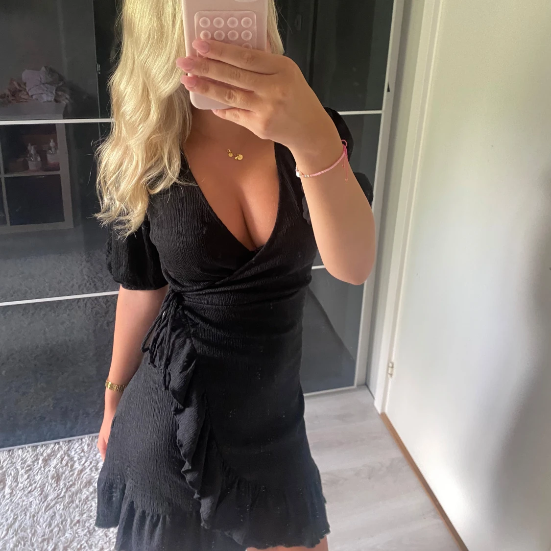 Supersnygg svart kort omlottklänning med puffärmar och djup v-ringning. Klänningen har knyt i sidan och volangdetaljer💗💗