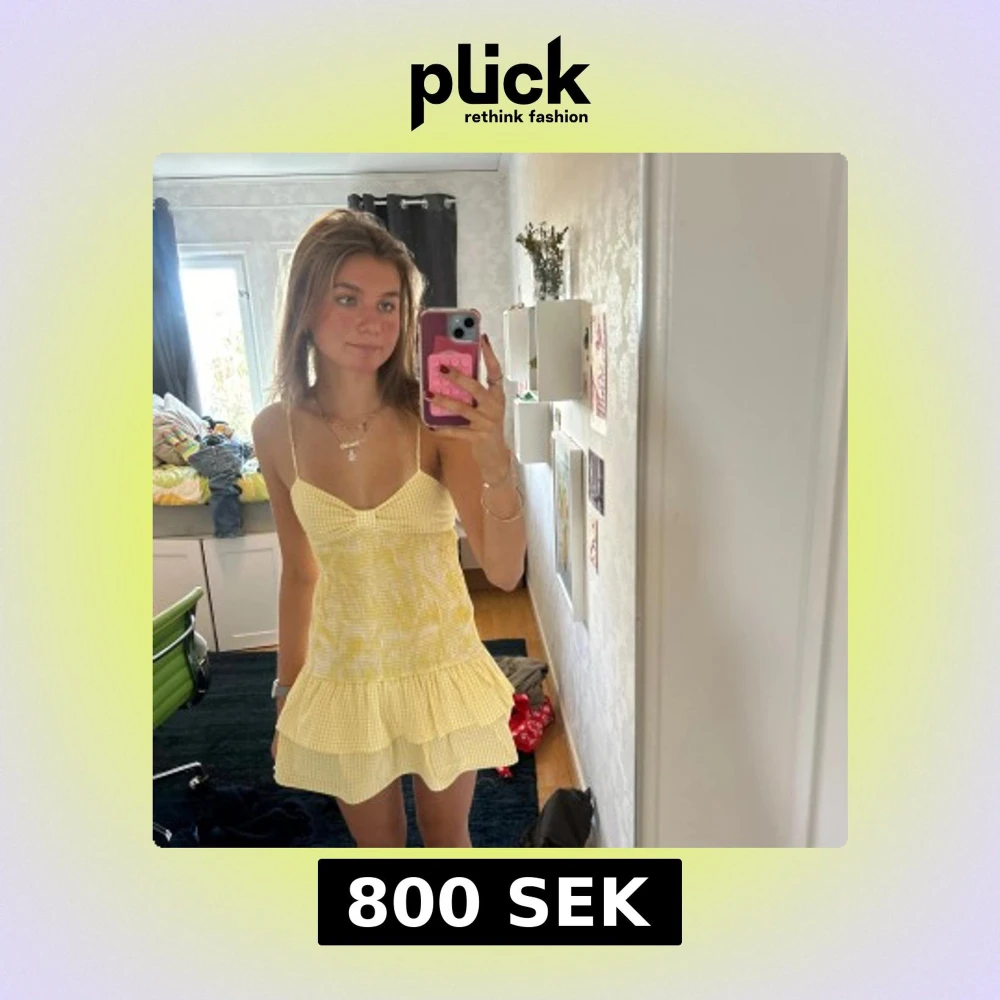 Populär gul klänning med rutigt mönster och volangdetaljer. Har endast använts 2 gånger så är i perfekt skick!! Supersöt och perfekt till sommaren ❤️🙌