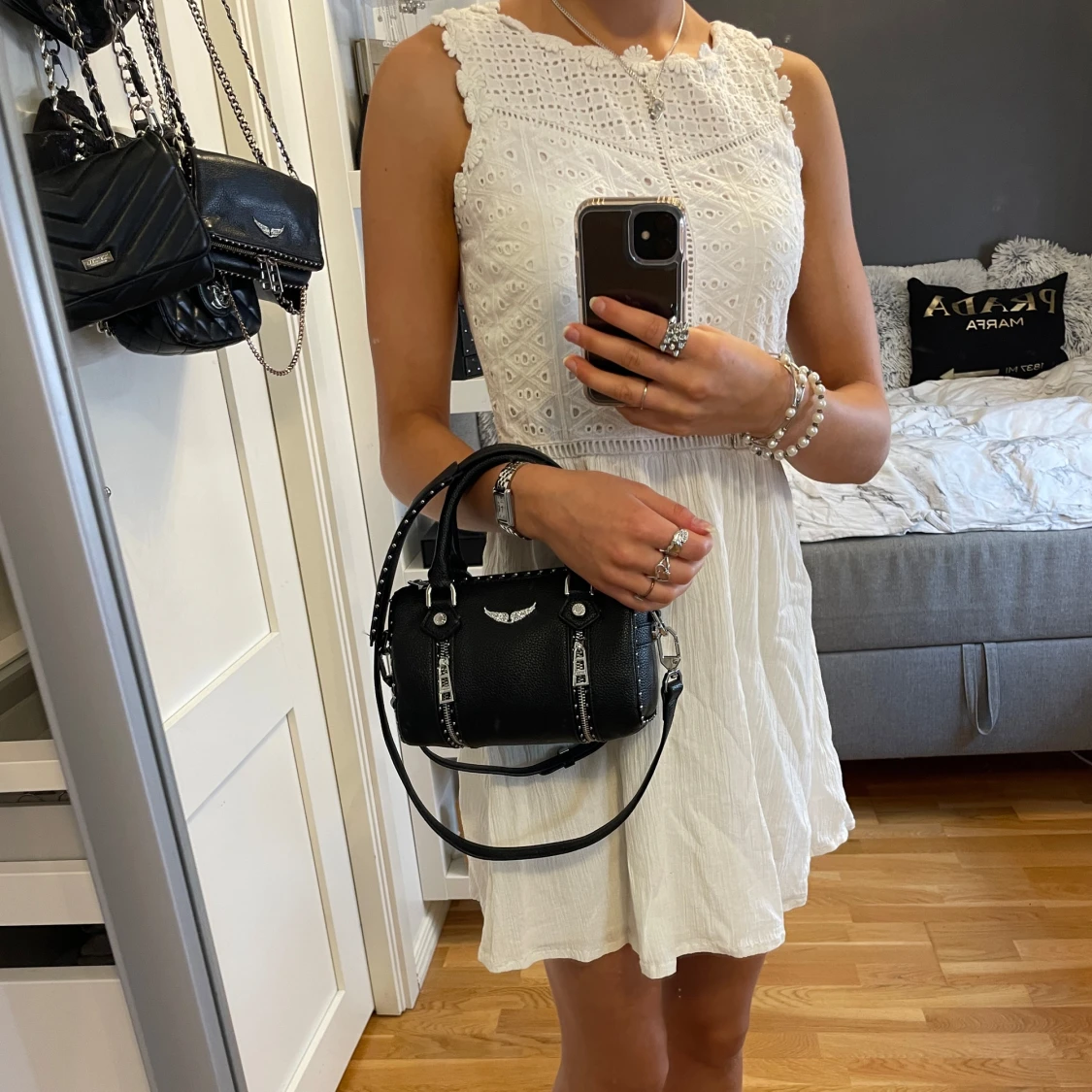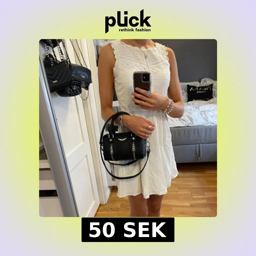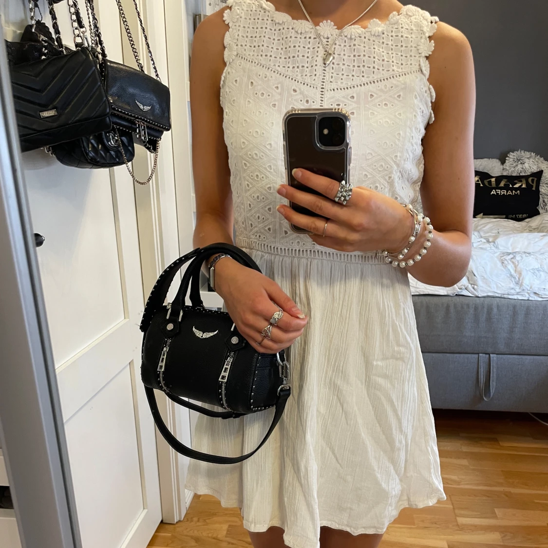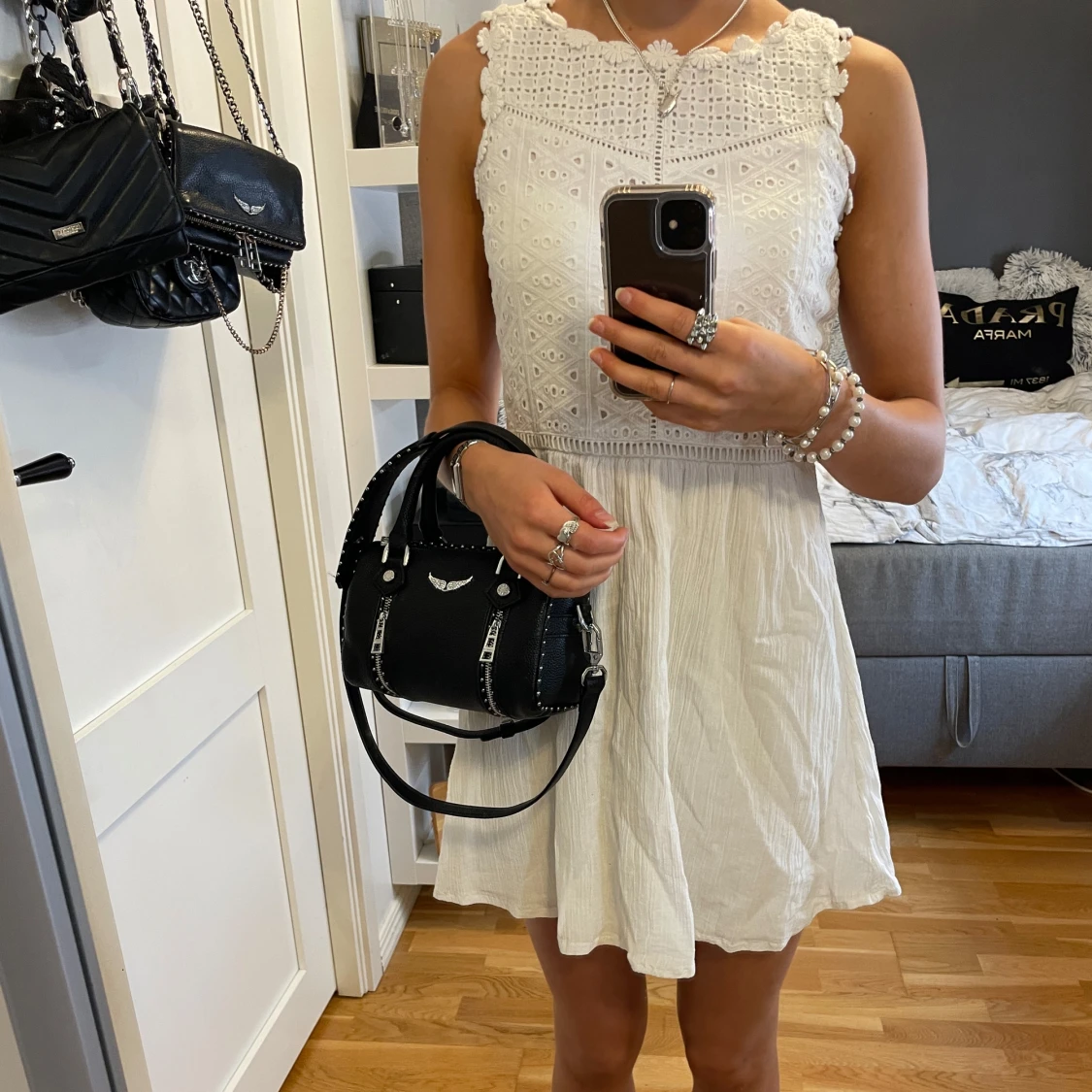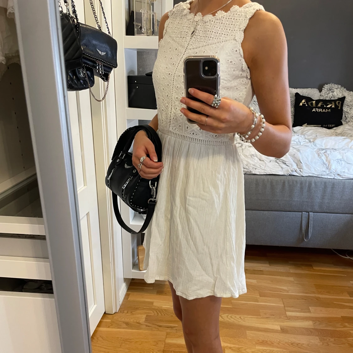 Supersöt vit kortklänning med broderade spetsdetaljer och fina mönster och volangkant upptill. Storlek XS.