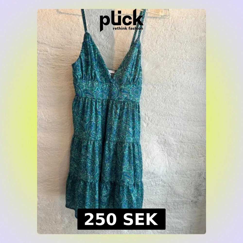 Säljer en kortklänning med paisleymönster i blått och turkost. Klänningen har smala axelband, v-ringning och volangdetaljer i kjolen. Perfekt för varma dagar och har en luftig passform.