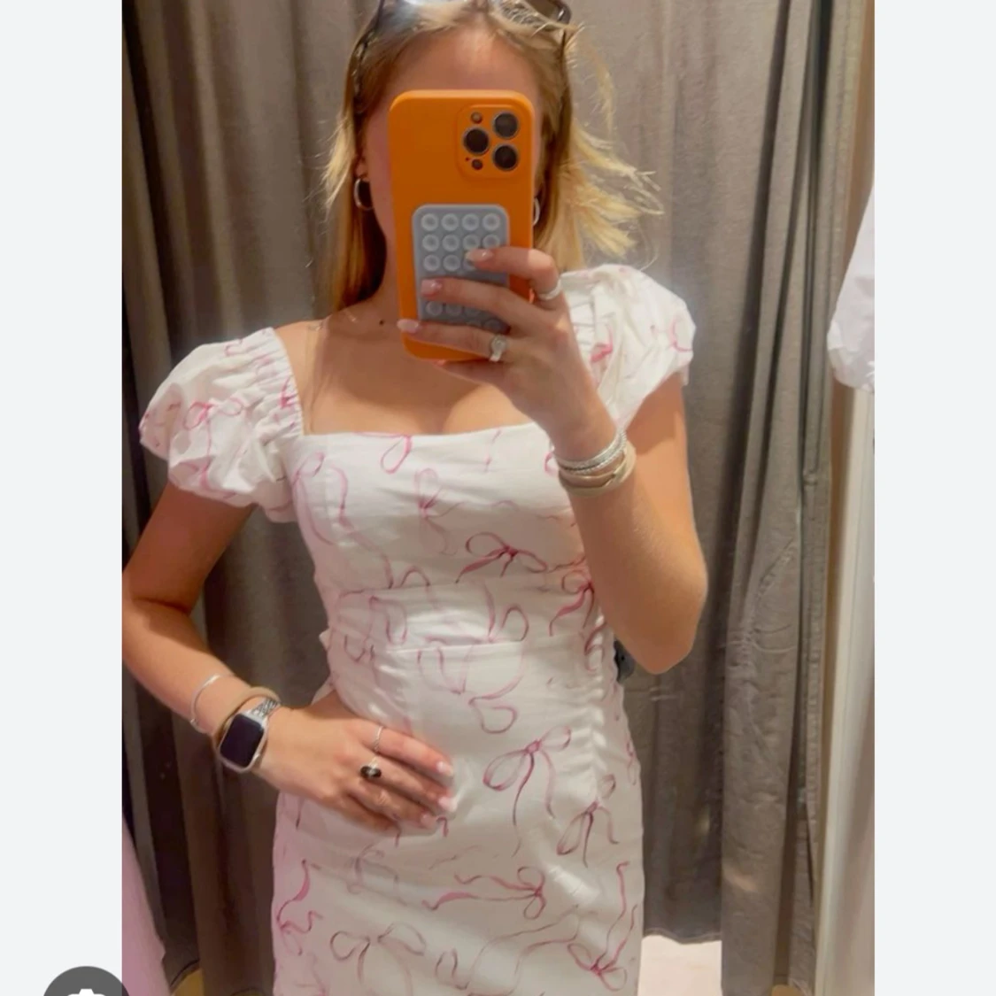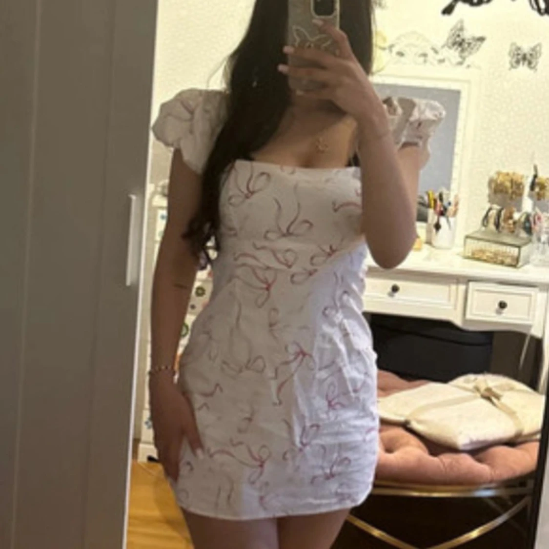 Supersöt vit kortklänning med puffärmar och fyrkantig urringning. Klänningen har ett rosa rosettprint över hela tyget och sitter figurnära. Perfekt för sommarens alla tillfällen och ger en riktigt gullig vibe.