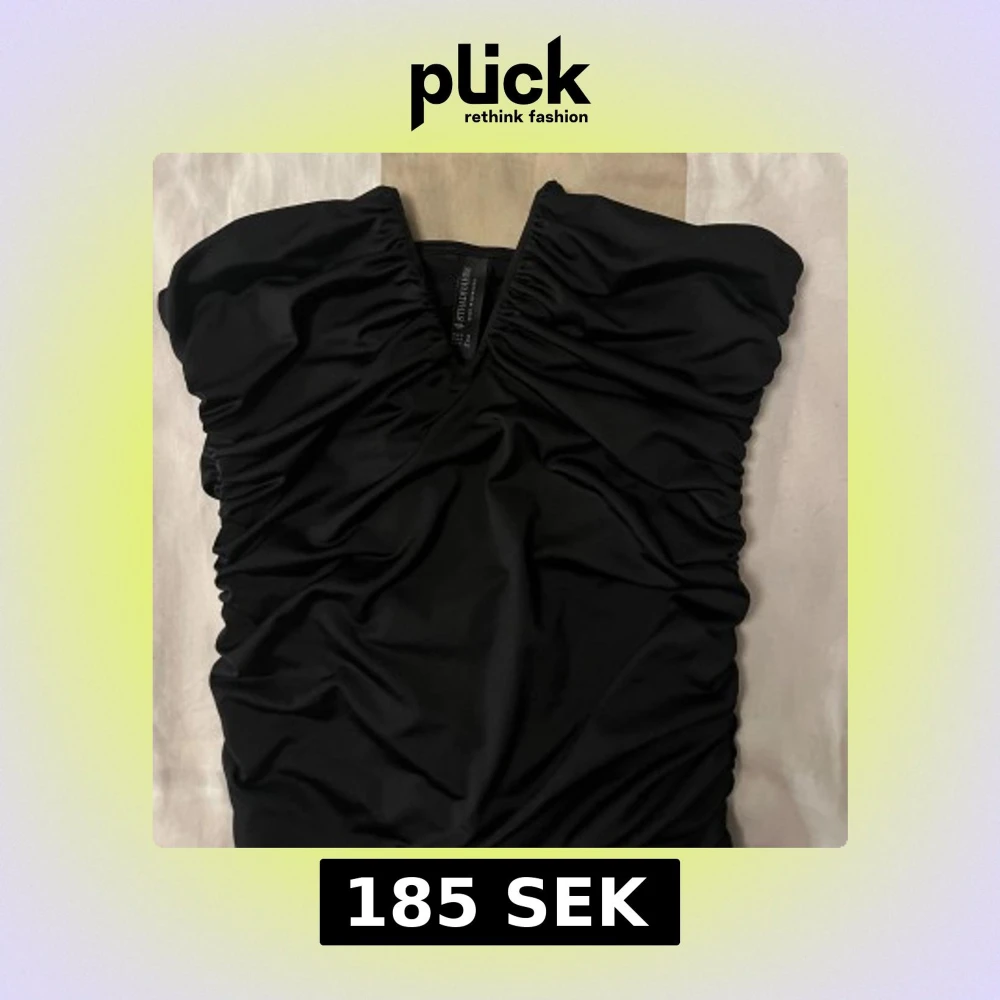 Supersnygg svart kort klänning från Stradivarius med v-ringning och draperade detaljer längs sidorna. Klänningen är axelbandslös och har en tight passform som framhäver figuren. Perfekt för dig som gillar en stilren och trendig look.