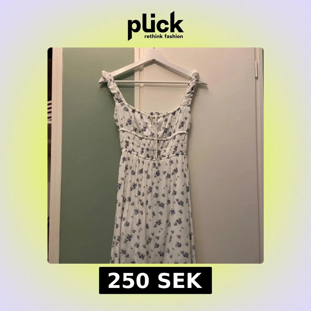 Supersöt vit kortklänning med blått blommönster och breda axelband. Klänningen har smock i midjan, knytning framtill och lätt rynkad kjol. Från stradivarius.