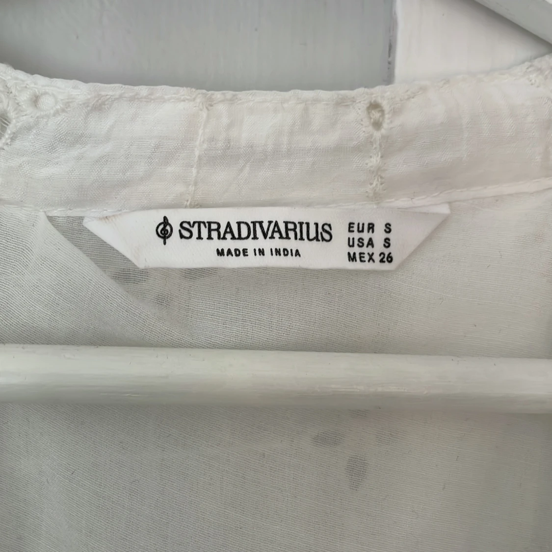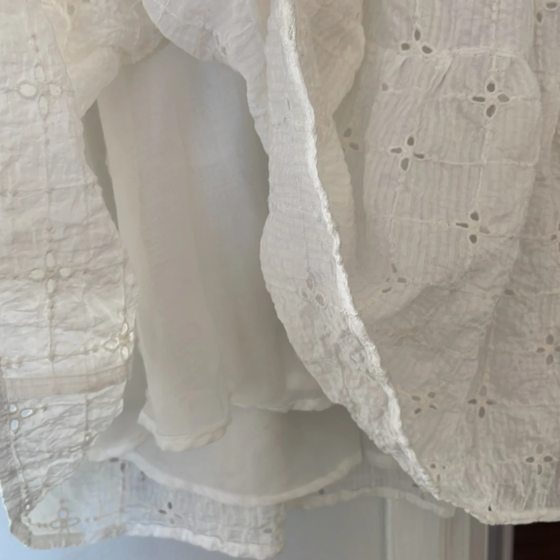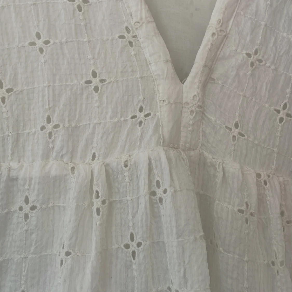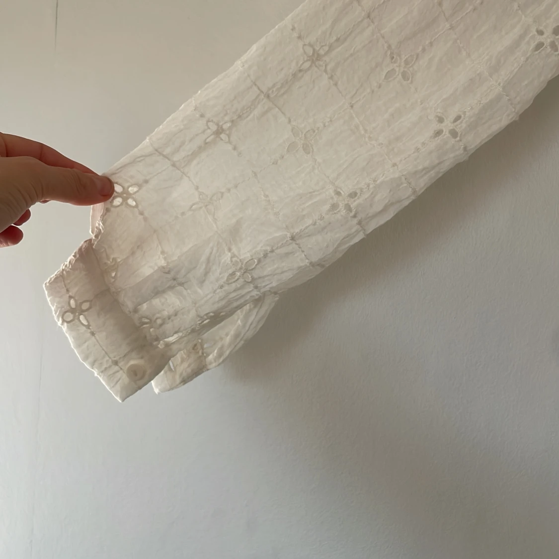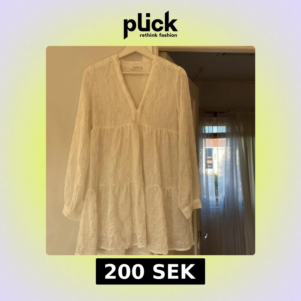 Jag säljer nu en vit klänning i broderat tyg. Den har lång ärm med knappar längst ner, underkjol och är luftig. Uppklädd till fest men även skön till stranden. Använd 1 gång. Skick 10/10