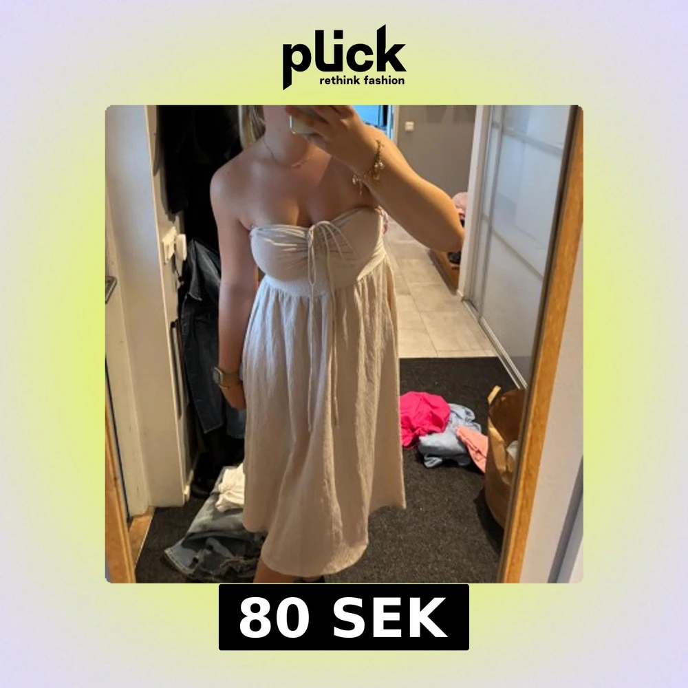 Superfin beige axelbandslös klänning med knyt framtill. Perfekt till stranden eller när man vill ha nått lätt.