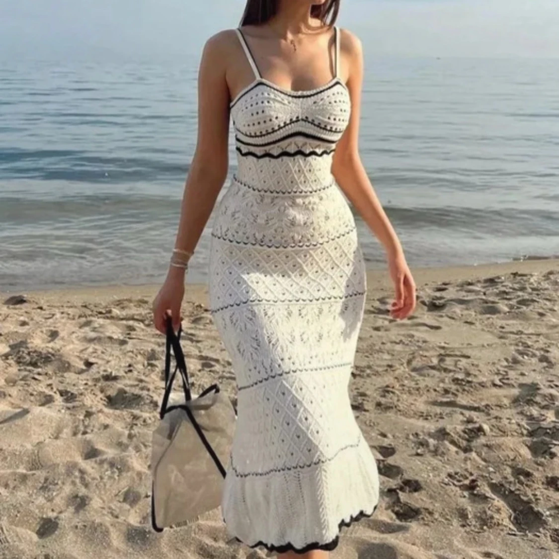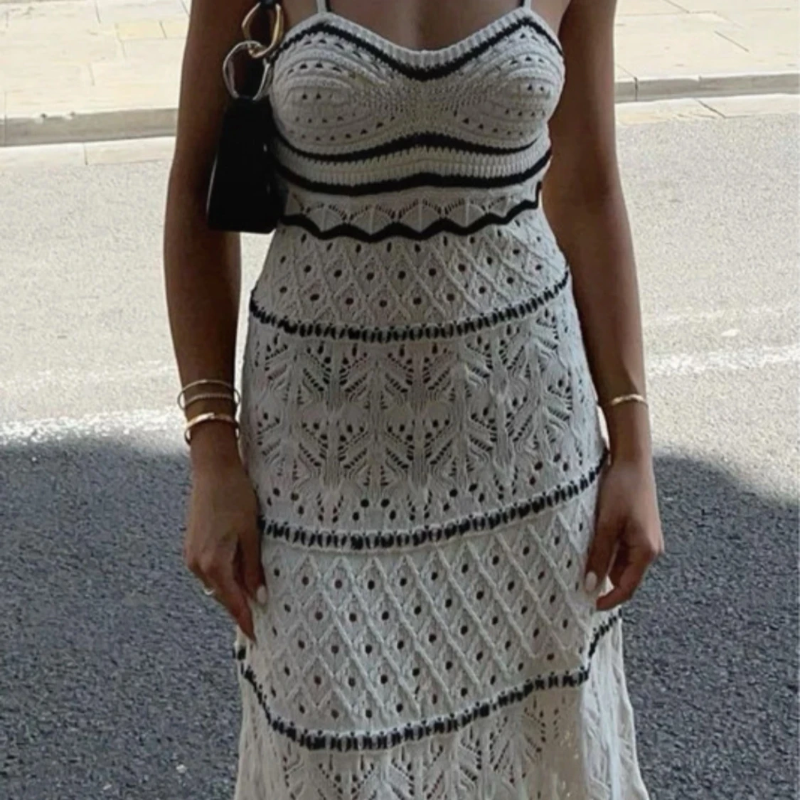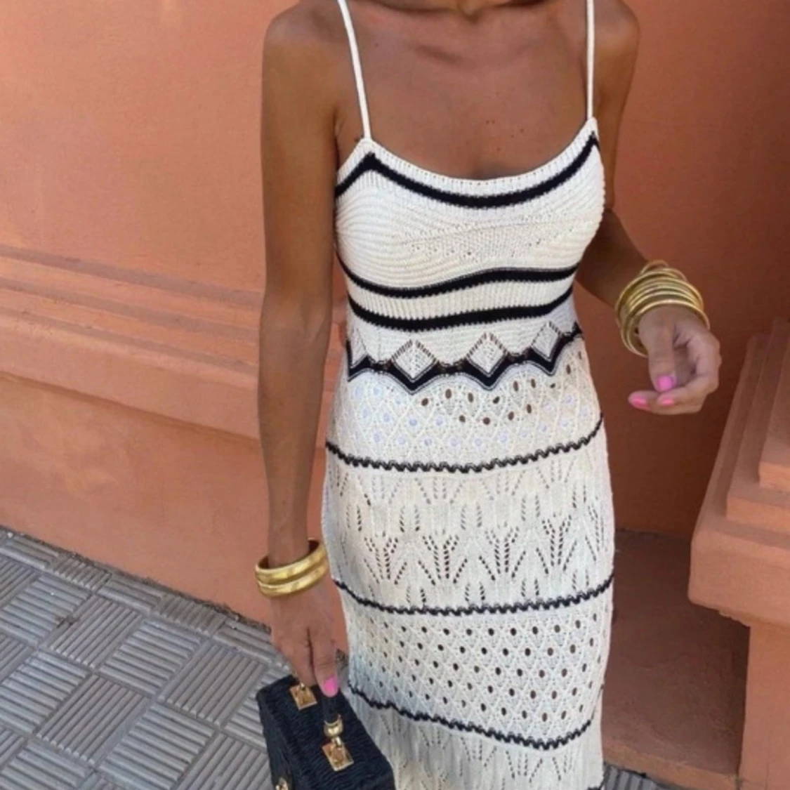 Midi klänning i virkat materiql från Zara i ljust beige och svart , i fint skick.