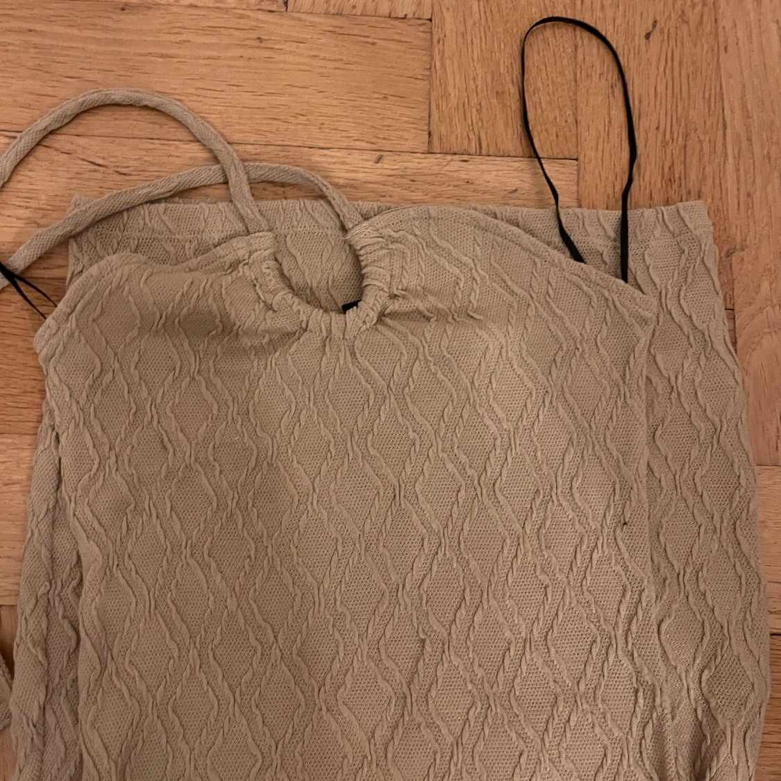 Snygg beige stickad klänning med ett diskret mönster och smala axelband. Perfekt för en stilren look. 50 kr st. 80 kr för båda