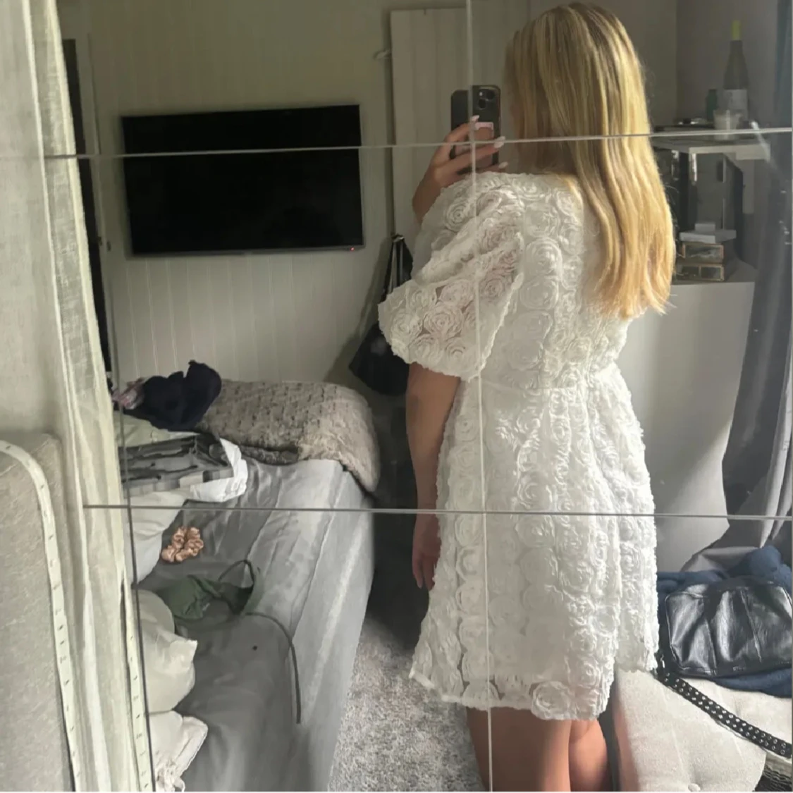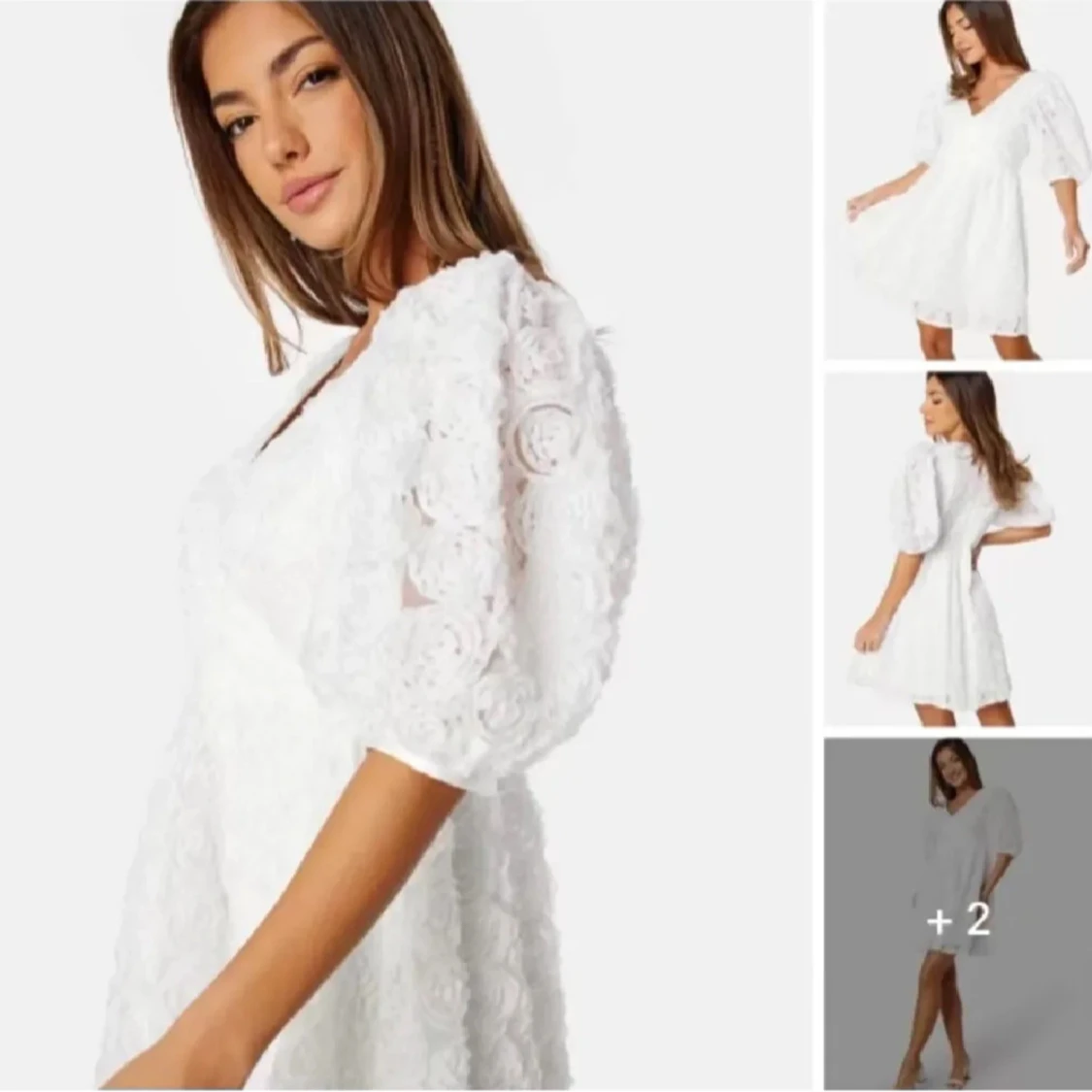 Superfin vit klänning i spets med puffiga kortärmar. Perfekt för studenten eller midsommar. Klänningen använd 1 gång och är i mycket bra skick, storlek S men passar M också🤍