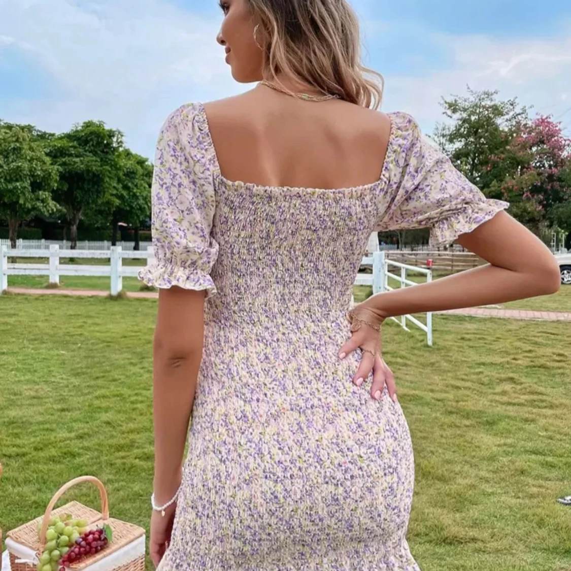 Superfin ljuslila kortklänning med småblommigt mönster och puffärmar. Klänningen har söt knytning framtill, cut-out detalj under bysten och smockad midja för en figurnära passform. Perfekt för sommarens picknickar eller häng i parken.