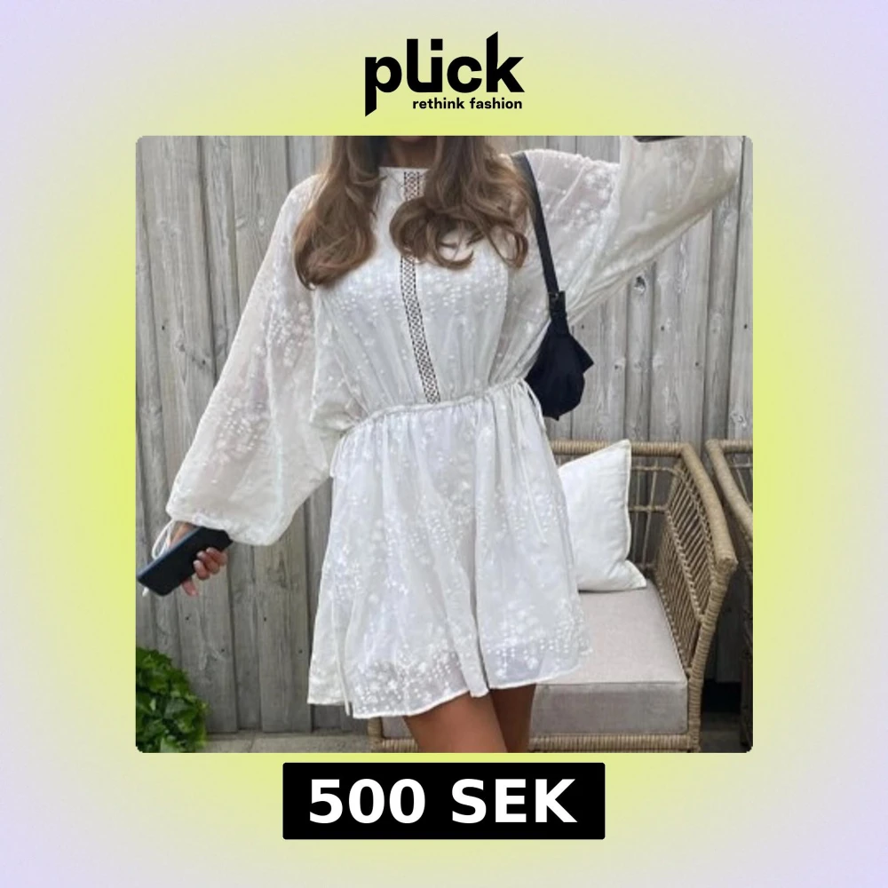Superfin vit klänning med broderade detaljer och lös passform. Klänningen har långa, vida ärmar och en markerad midja med resår. Dekorativ spets längs mitten framtill. Perfekt för sommarens alla tillfällen! Passar allt från xs-m då den är justeringsbar