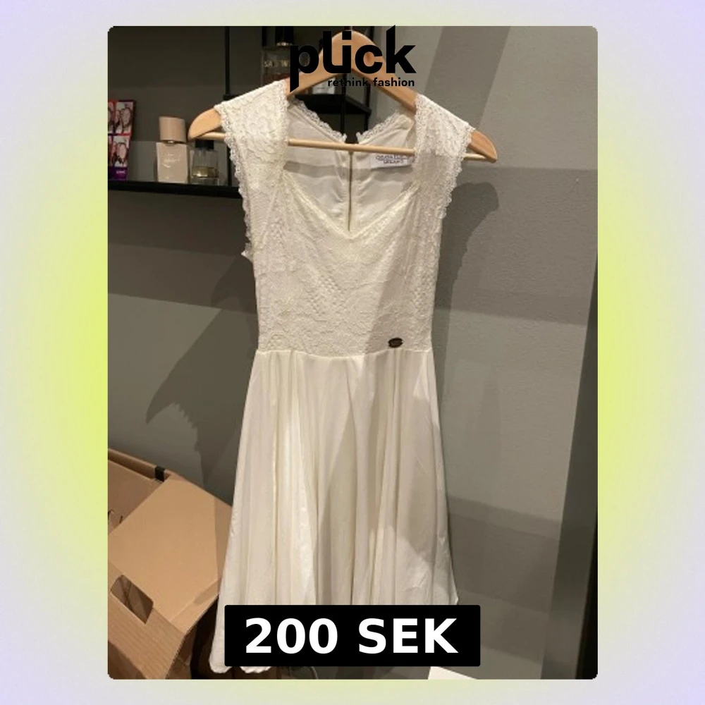 En fin klänning i färgen vit, använda 1 gång på en skolavslutning. Den har en guld detalj vid midjan, storlek xs, köpte den på bubbleroom