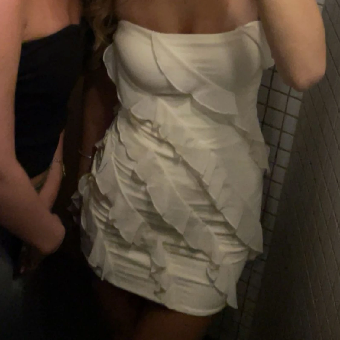 Vit volang klänning från oh polly! Så fina detaljer och den sitter helt perfekt. Inte för kort heller! Perfekt till fest, student eller andra tillfällen. Använts 2 gånger och har kem tvättats så den är som ny!
