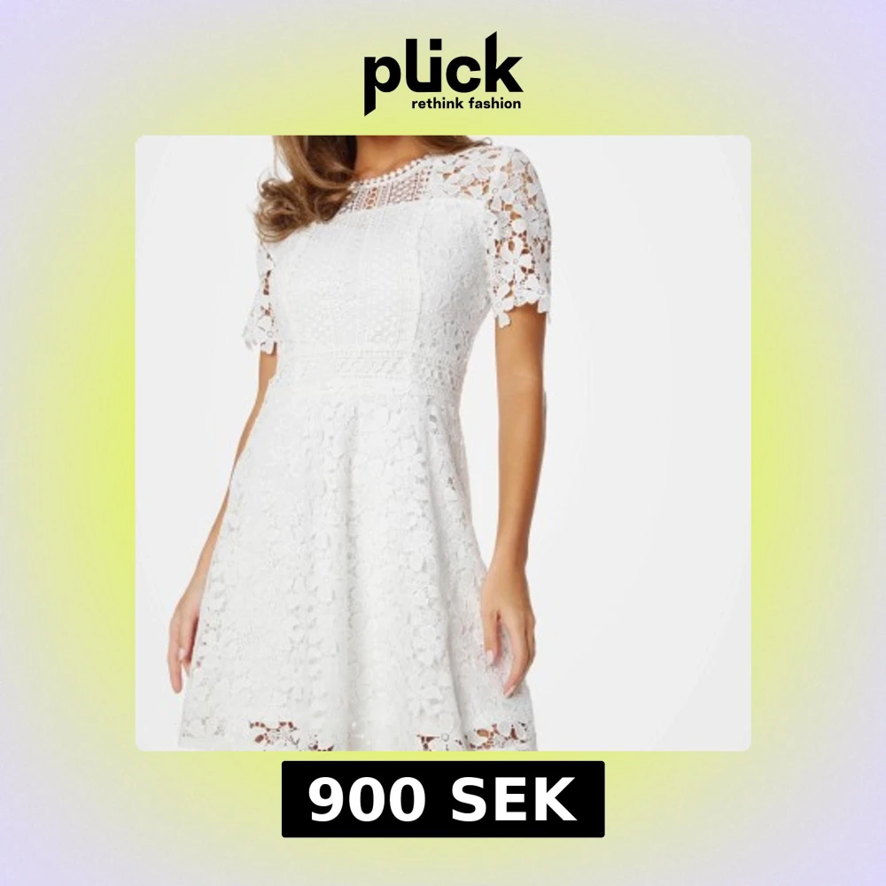 Superfin vit klänning i spets med korta ärmar och rund hals. Klänningen har ett blommigt mönster, dragkedja i ryggen och lätt utställd kjol. Perfekt för somriga tillfällen eller studentfirande! Klänningen är från bubbelroom med lapp kvar, helt ny. Skriv för frågor osv😍storlek xs/32