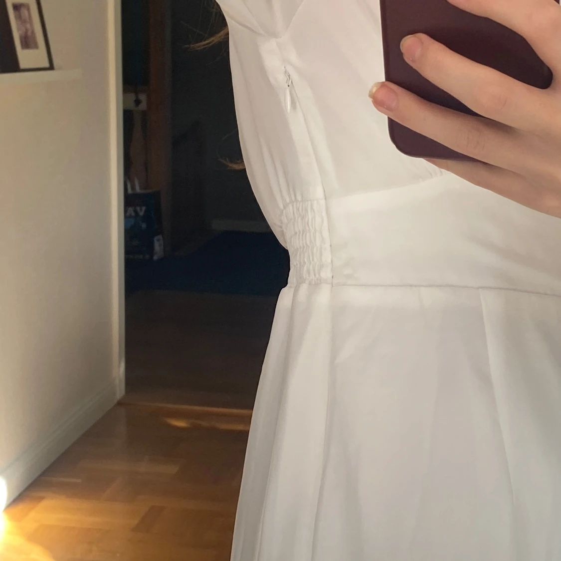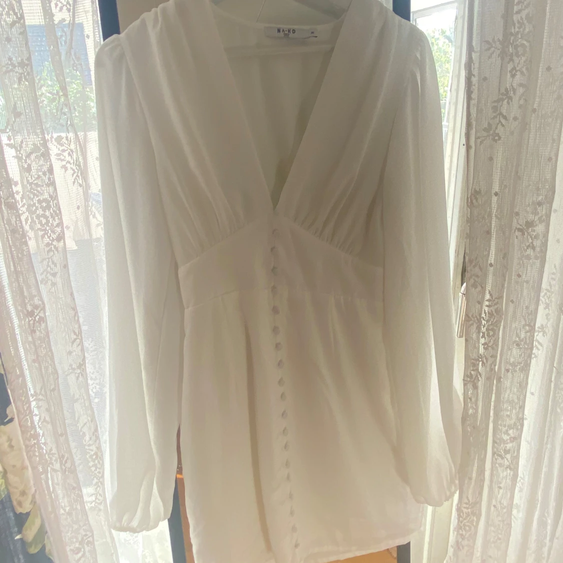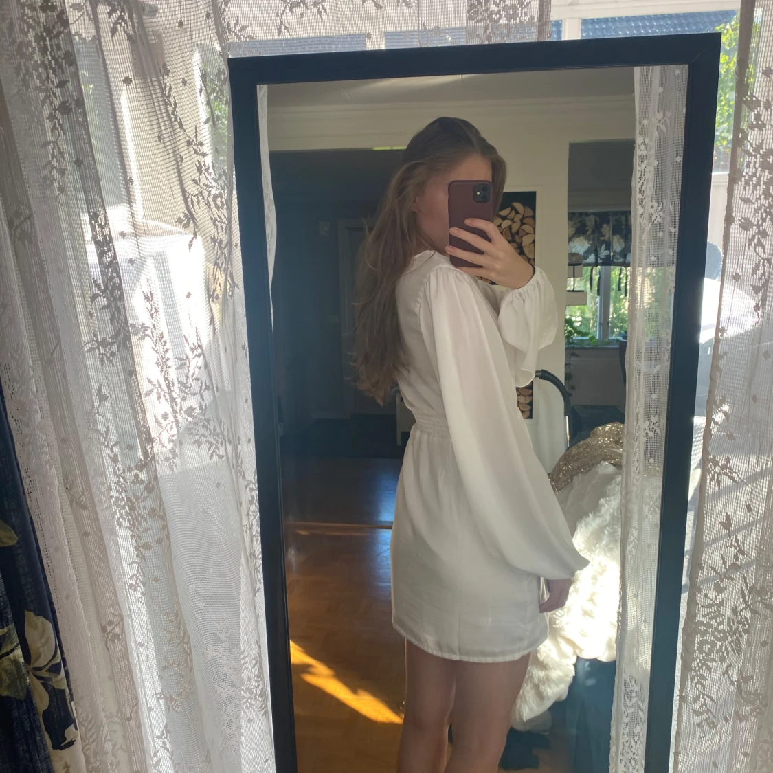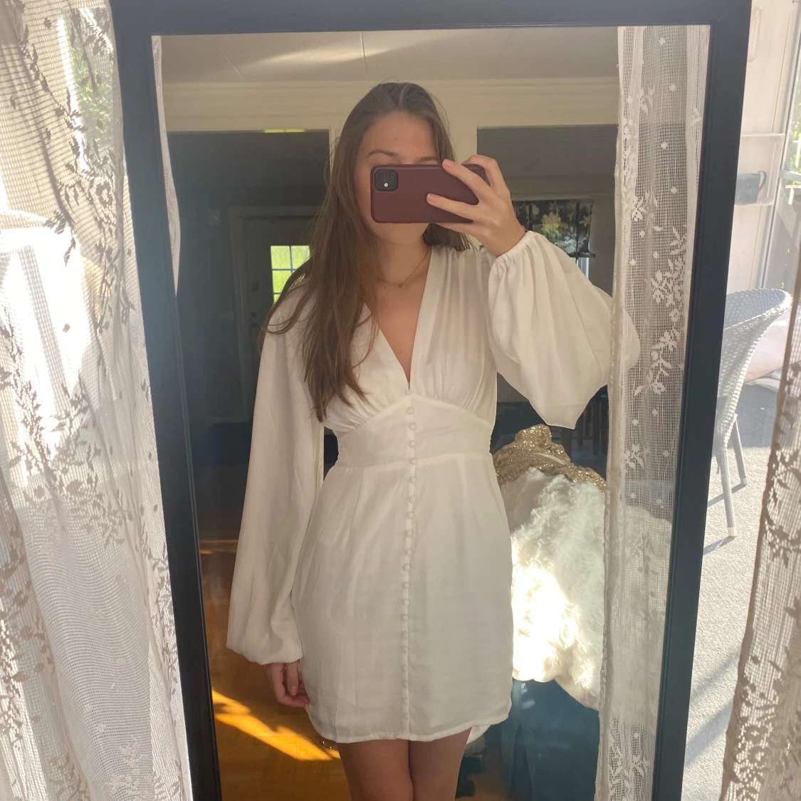Superfin vit kort klänning med v-ringning och långa puffärmar. Passar perfekt till student eller vad som. Den är använd och syns inte på långt håll men den är lite sliten